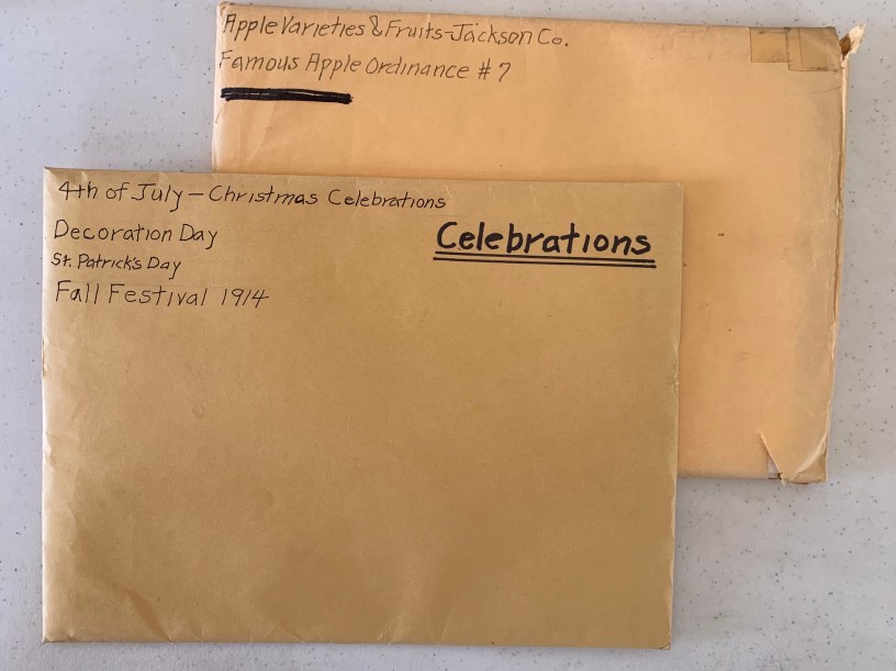 .005: Apple Varieties & Fruits-Jackson Co., Famous Apple Ordinance #7; these envelopes contain ‘Doc’ Parry’s clippings, writings, collections of newspaper stories related to the well-marked outside of envelope. The Famous Apple Ordinance #7 was written about by Megan Malone and presented to Jackson City Council, (contained in binder in kitchen built-in shelves).