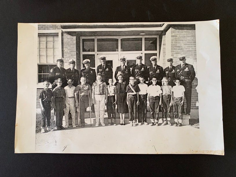Top row left to right Frank Eisnaugle (father of Mike Eisnaugle pictured in front rown with crutches), Dennis Baisden, Myron Williams, Herman Stiles, Chief Elba Ross, Robert Lewis, Charles Rice, Alfred Richards, Carl Barnett.