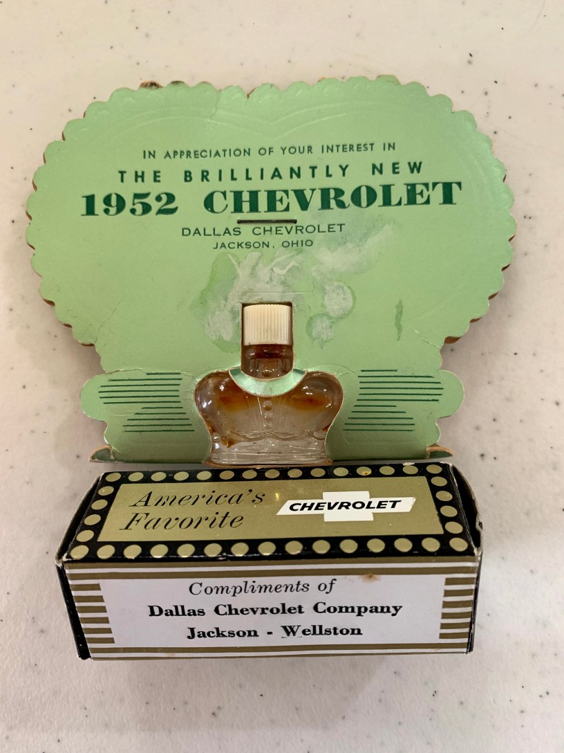 .02 green Prince Matchabelli cardboard perfume holder branded 1952 Chevrolet Dallas Chevrolet Jackson Ohio.