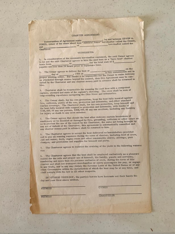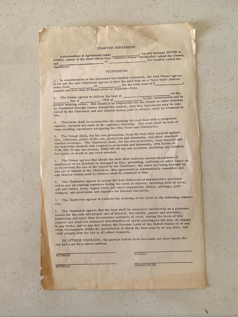 Description: blank copy of the Charter Agreement between charter and Edwin A. Jones owner of the stern wheel boat “Admiral Jones”, typed copy, legal size paper.