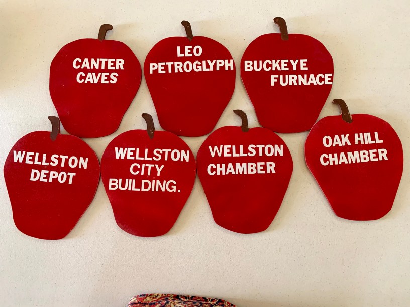 Description: wooden apples painted red with white lettering of businesses and tourist attractions. Items were donated to Jones Museum when Broadway St. office of Chamber of Commerce closed in 2019 with office moving to Office Commons on Huron St.