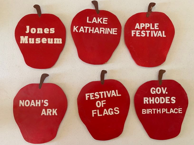 Description: wooden apples painted red with white letters used by the Jackson Chamber of Commerce to promote local tourism sites, donated to Jones Museum when Jackson Chamber moved from Broadway St. to the Off ice Commons on Huron St.