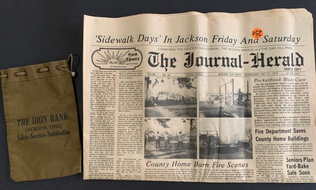 .01: cloth, drawstring money bag printed from The Iron Bank, Jackson Ohio with slogan Safety-Service-Satisfaction;