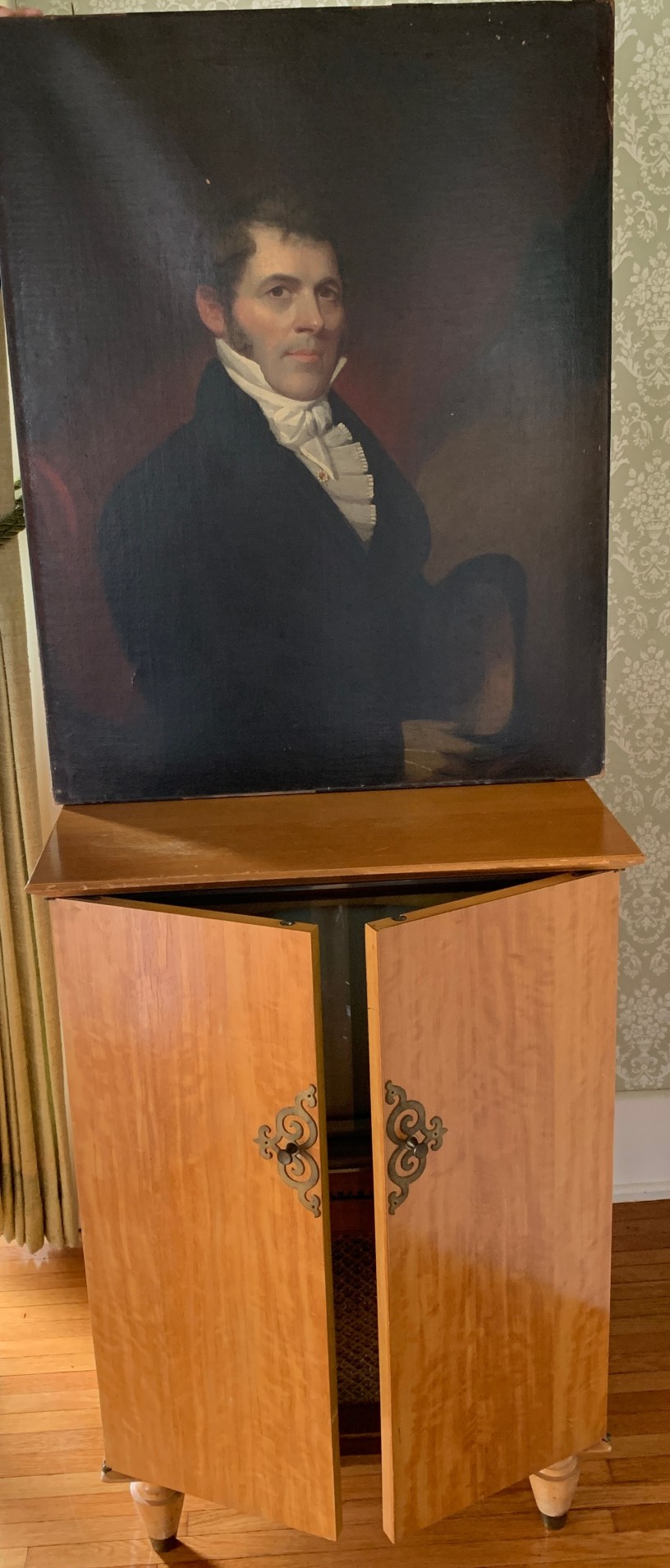 .101 oil portrait of unknown person done by unknown artist, was given to French family by Mrs. Schellenger after she originally gave it to the Jackson Christian Church seemingly as original denomination founder. Then was given to French family after church decided it wasn’t a portrait of a founder. Portrait hung in upstairs in French home for years.