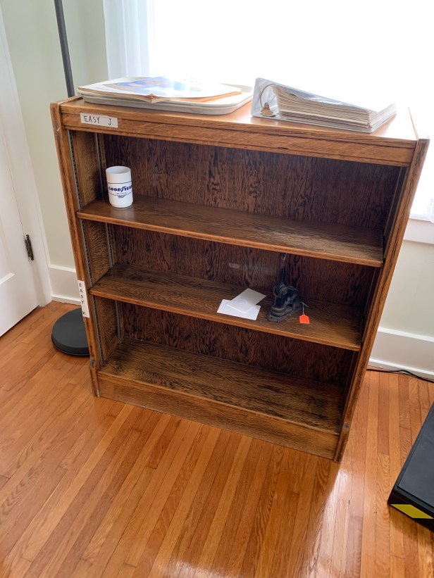 Description: Oak shelving unit originally purchased for books for library at Memorial Building (1938-1975) in use for children’s section of Library, 21 Broadway, (1975-2020).