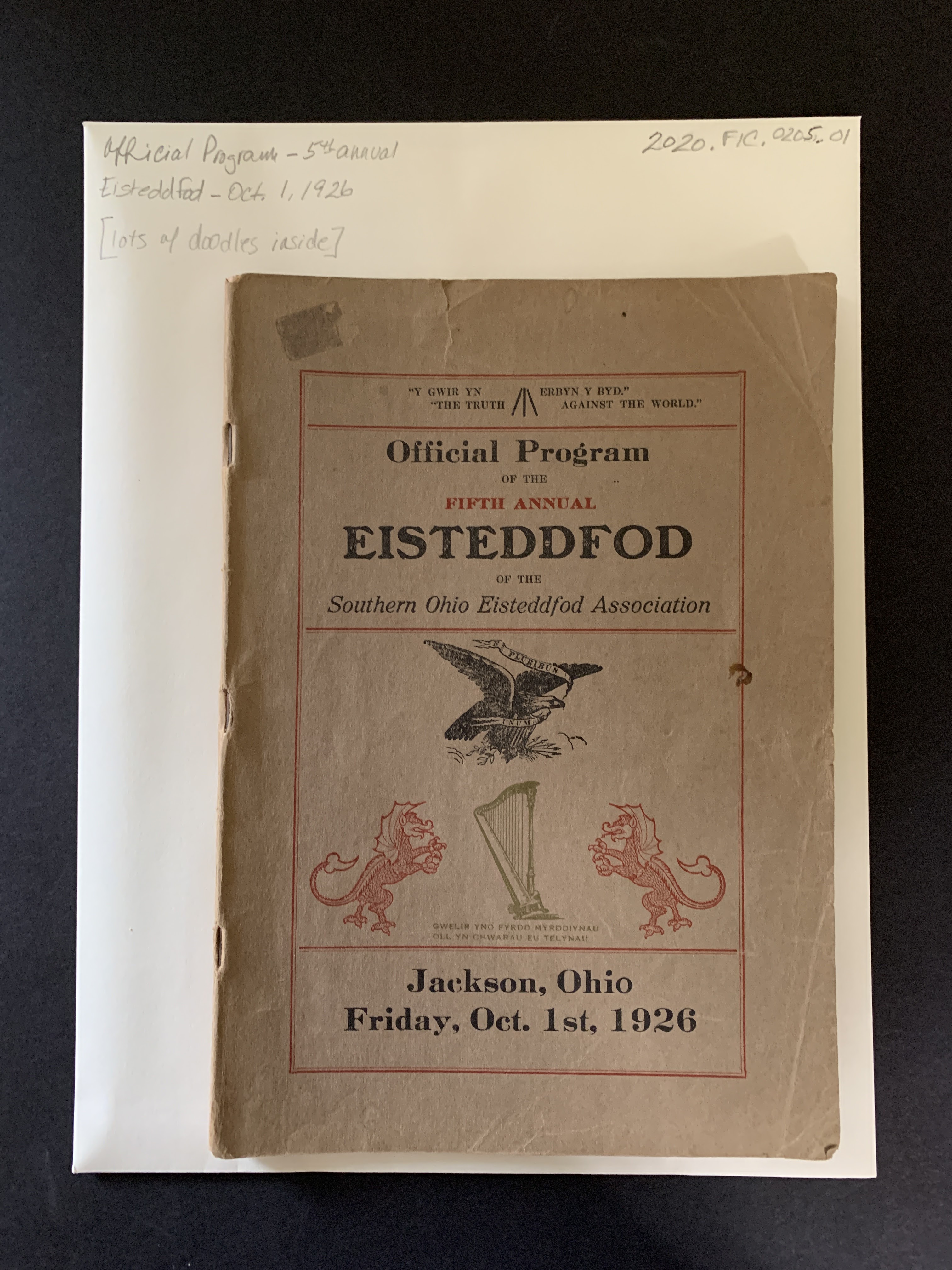 Description: Official Program (softbound) of the Fifth Annual Eisteddfod held by the Southern Ohio Eisteddfod Association, held in Jackson Ohio Oct. 1, 1926. Contains doodles and pencil drawings on b/w portraits inside. Item was found in Carriage House in February 2020 without an accession number.