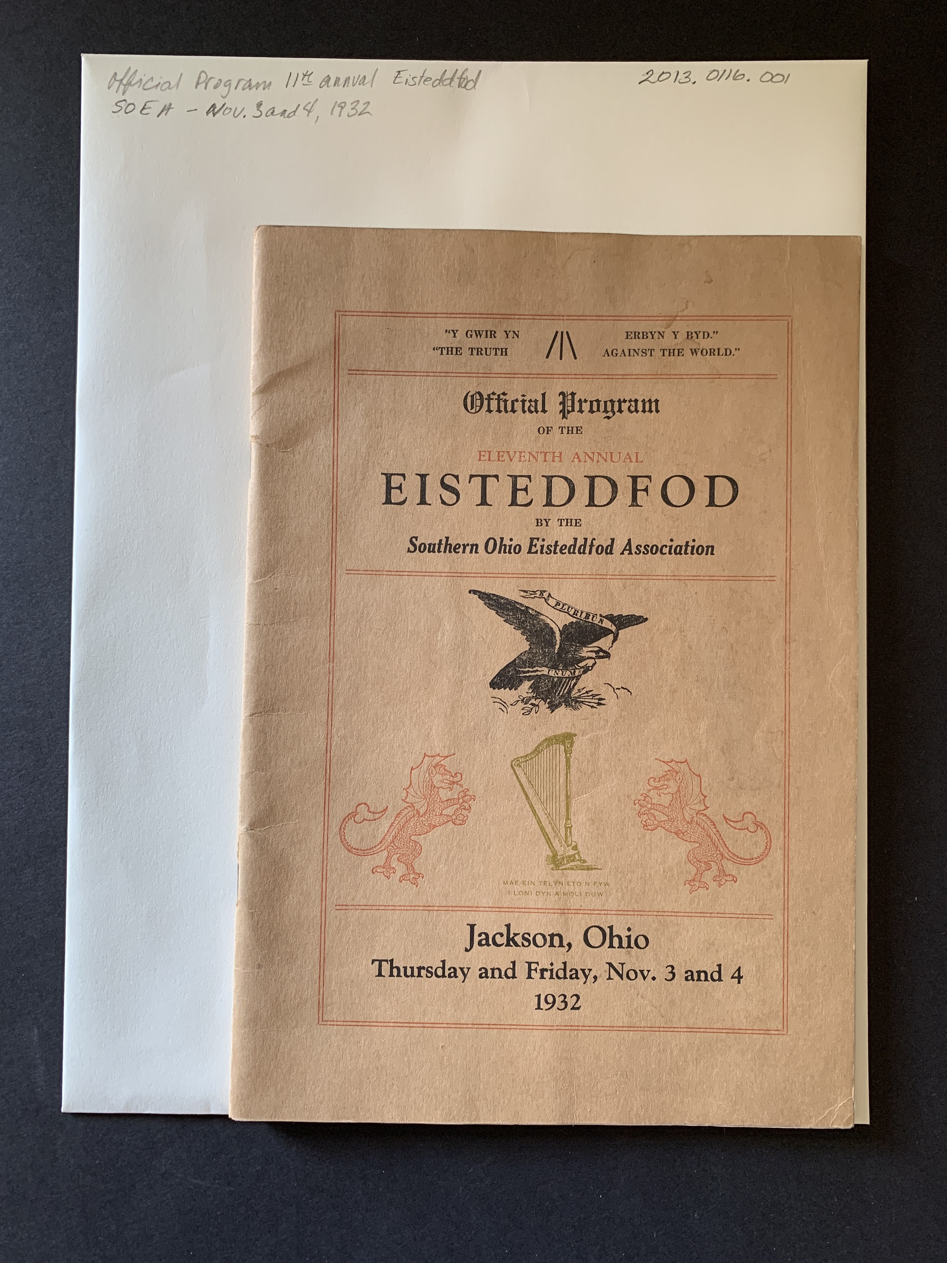 Description: brown southbound book with black and red lettering, Official Program of the Eleventh Annual Eisteddfod by the Southern Ohio Eisteddfod Association held November 3 and 4, 1932 in Jackson, Ohio.