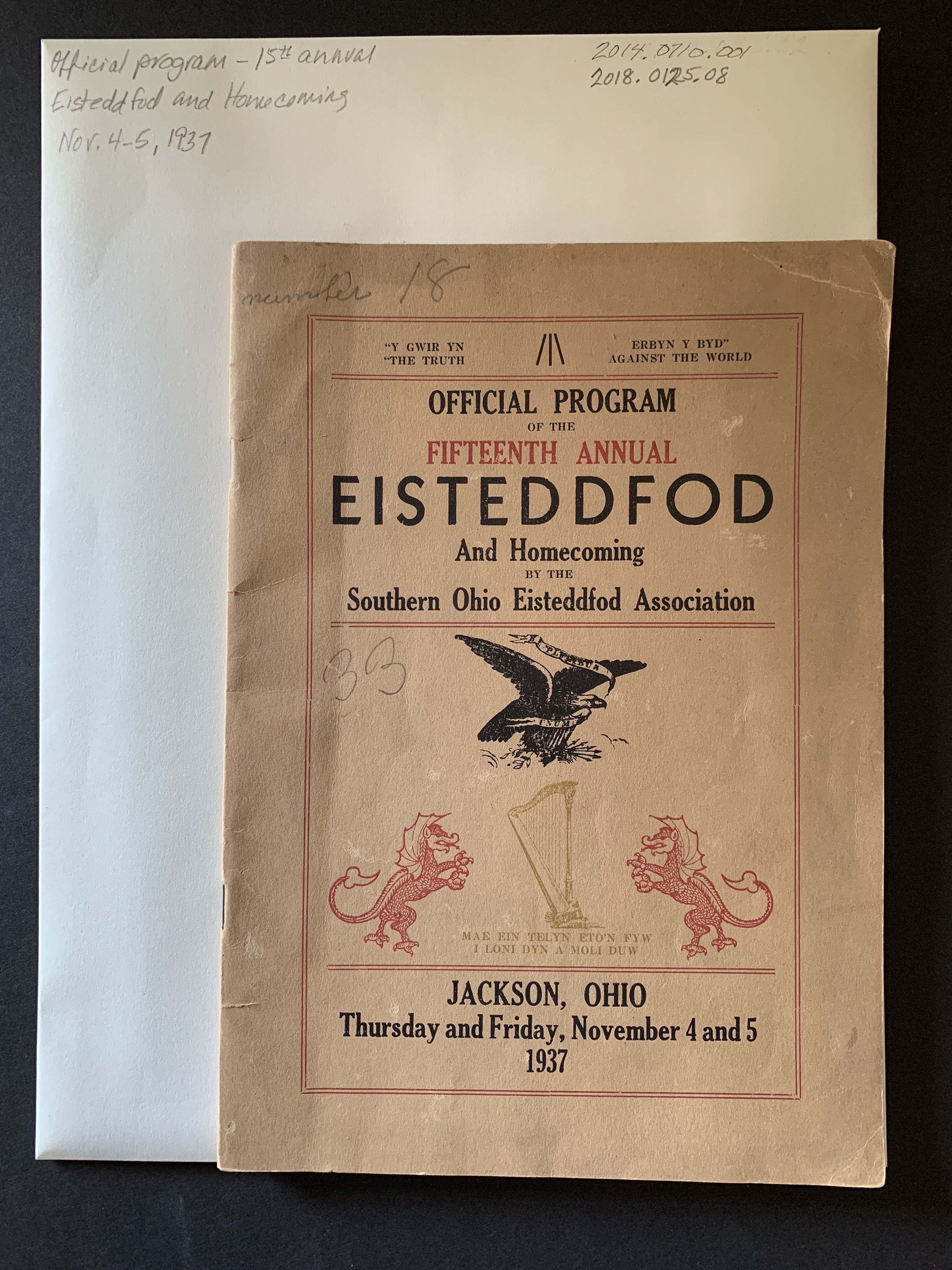 Description: brown softbound book with black and red text, Official Program of Fifteenth Annual Eisteddfod and Homecoming of the Southern Ohio Eisteddfod Association held in Jackson Ohio, November 4 and 5, 1937.