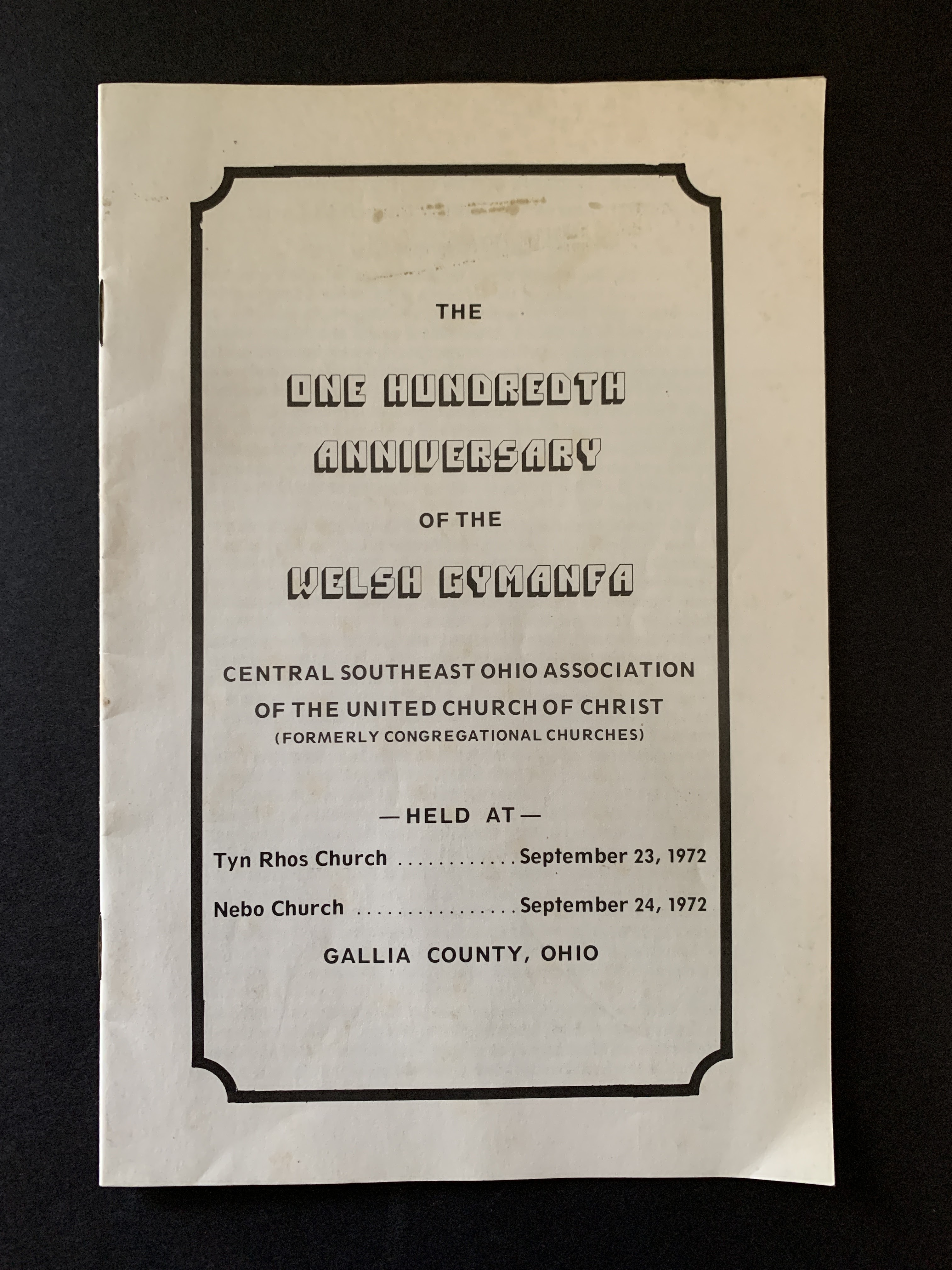Description: paperbound program from 100th anniversary of the Welsh Gymanfa sponsored by Central Southeast Ohio Association of United Church of Christ formerly Congregational Churches, held in Gallia Co. Ohio at Tyn Rhos Church (Sept.23, 1972)and Nebo Church (Sept. 24, 1972). Booklet is full of older b/w photos with names and histories.