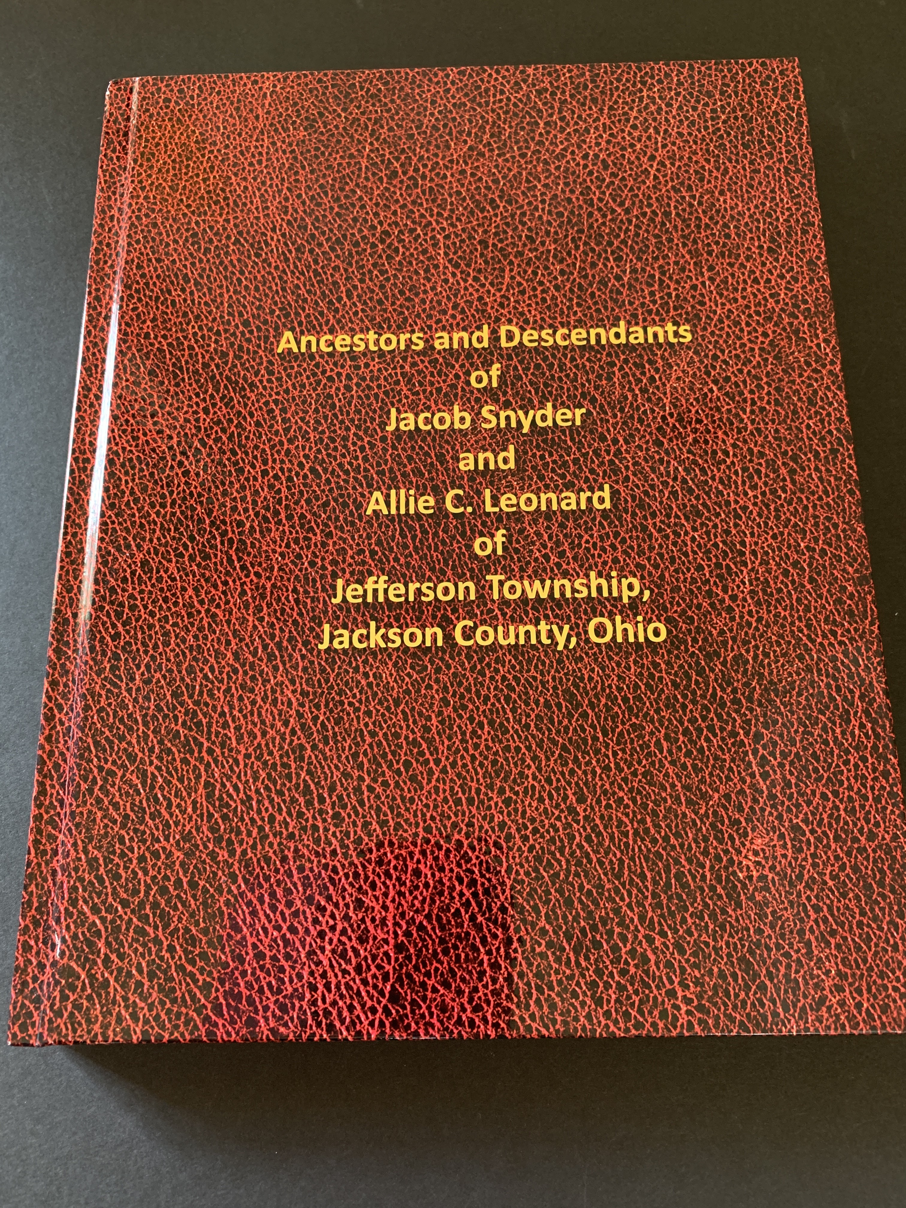 .01 hard bound, red cover book “Ancestors and Descendants of Jacob Snyder and Allie C. Leonard of Jefferson Township, Jackson County Ohio”, sent to Jackson City Library from Jefferson County Public Library in Steubenville Ohio who had received 2 copies of the book by mistake.