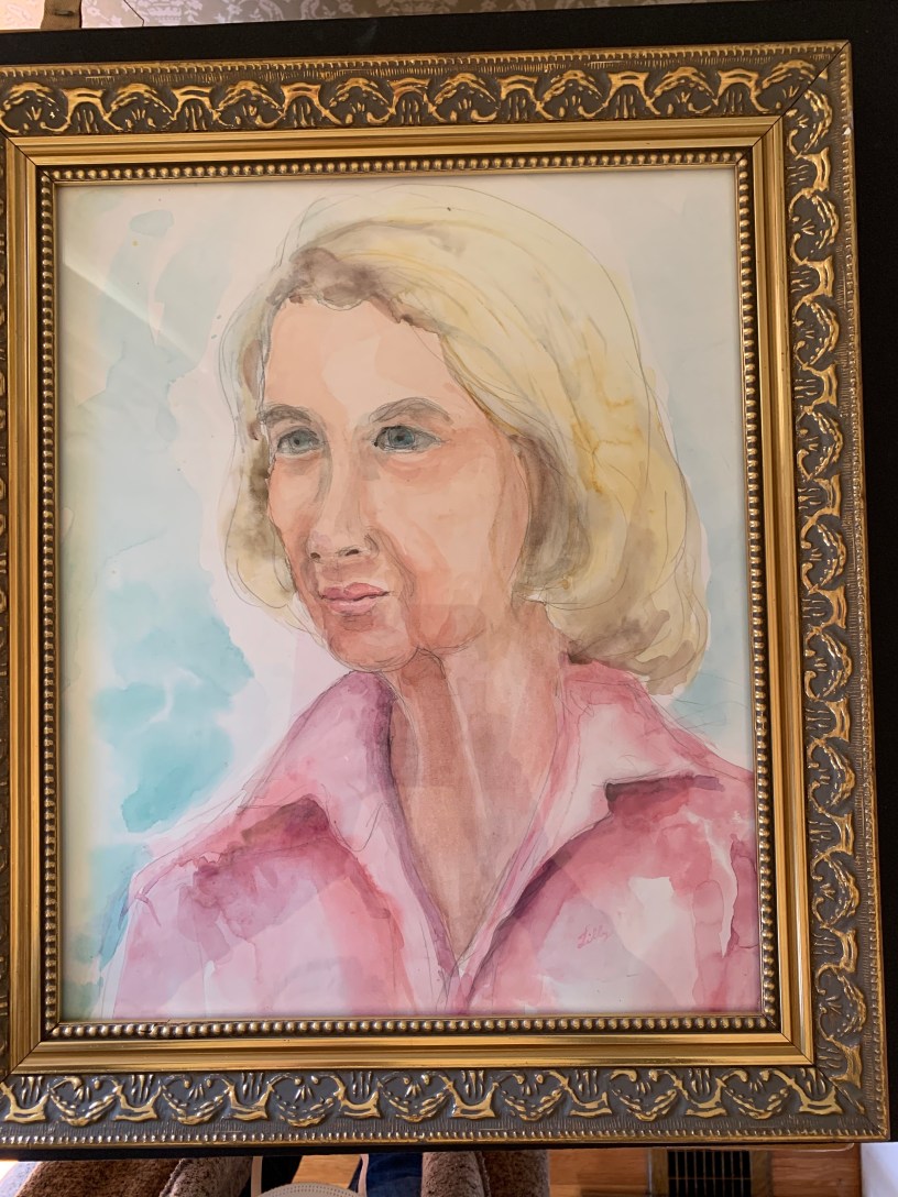 Description: framed watercolor self-portrait of Lilly Goldstayn (1925-2010) purchased by Griffiths at Goldstayn’s auction of belongings following her death in 2010. Goldstayn was a long-time Jackson County resident who used her artistic talents at various community sites.