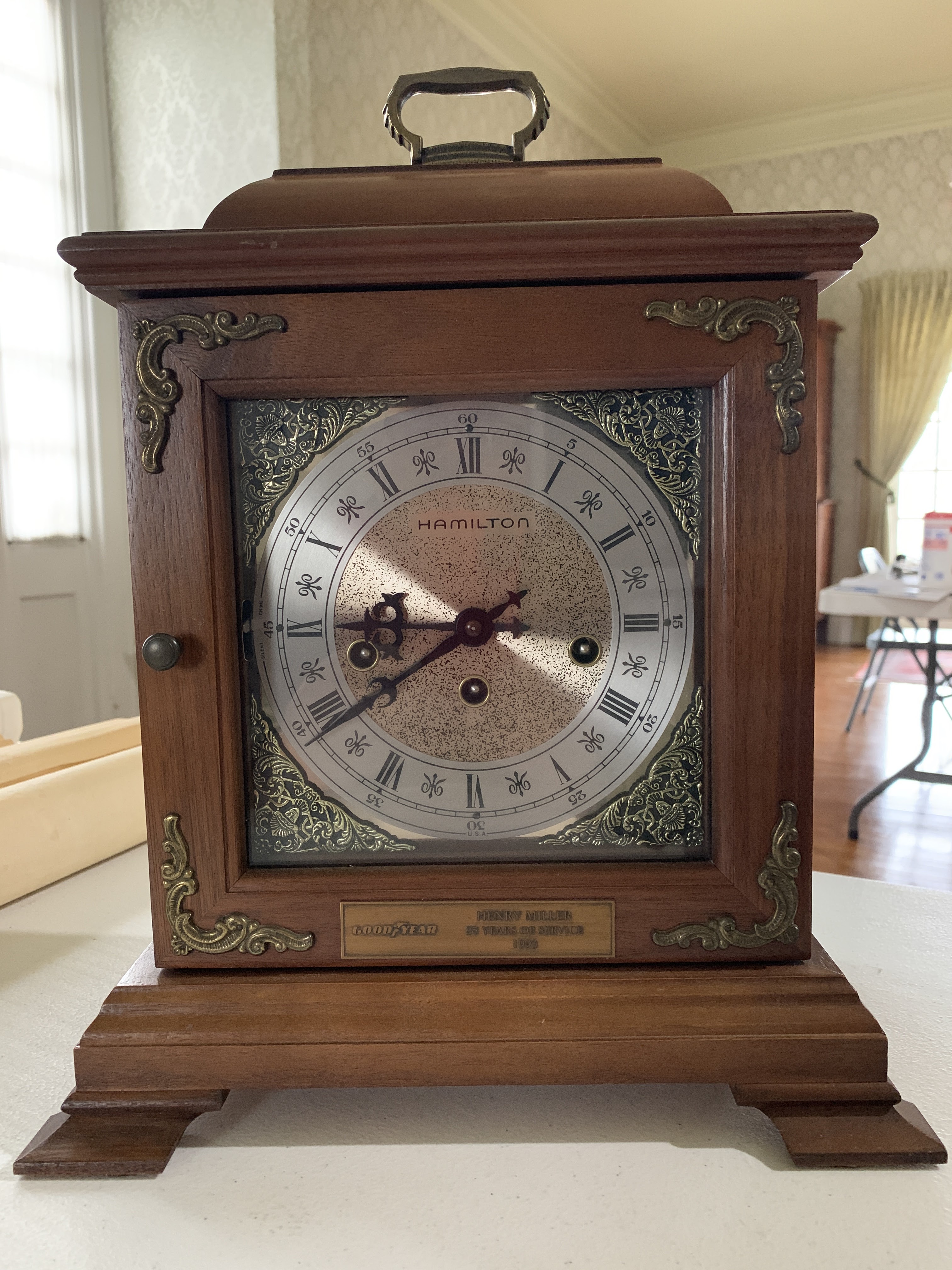 .01 corporate service award for 25 years from Goodyear in Jackson. Clock is roughly 10×15 inches, wood, roman numerals, Hamilton brand.