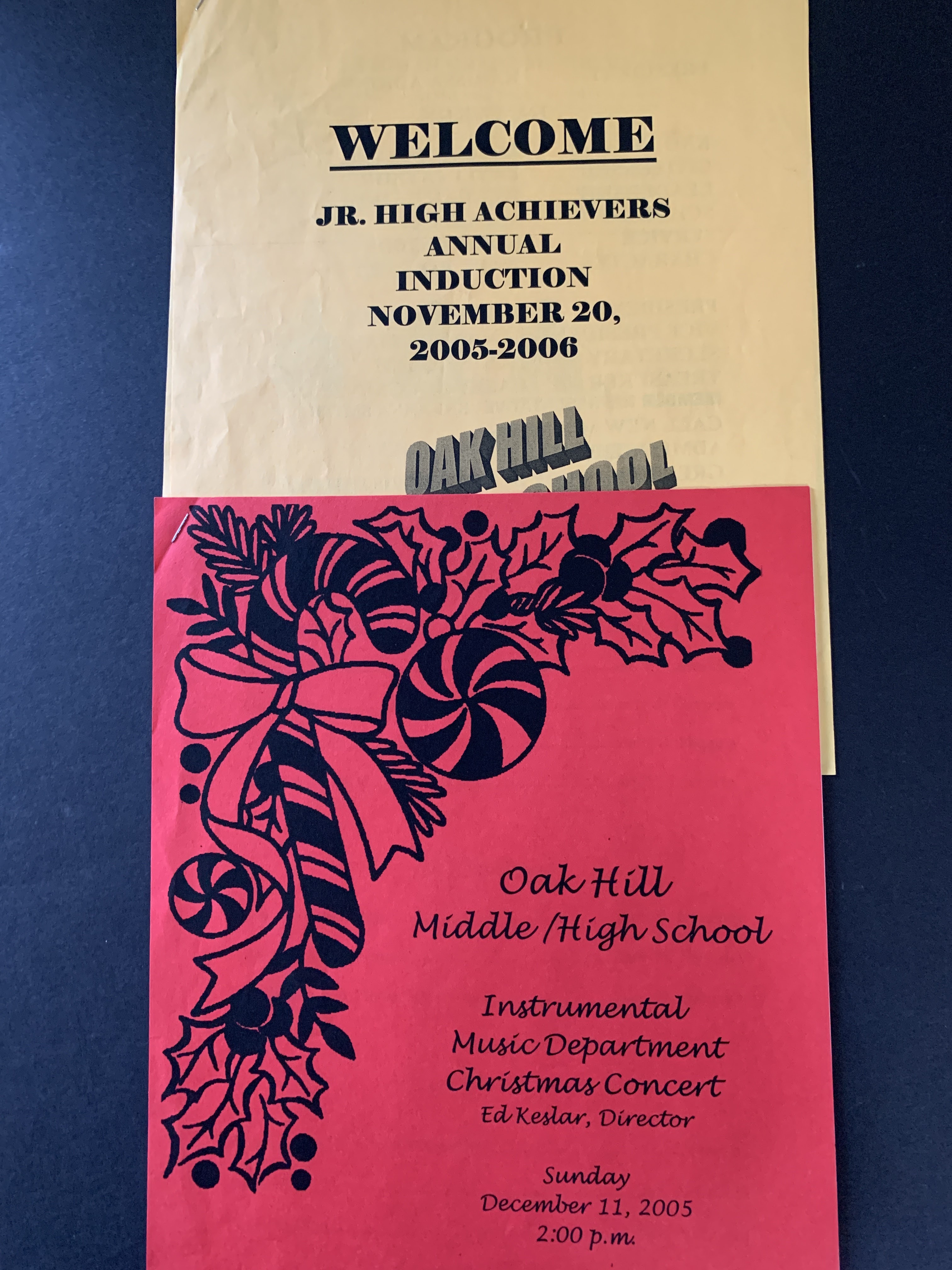 Description: two colored paper programs (originals) from Oak Hill Middle and High School, many names of participants grades 6-12 and school administrators.
