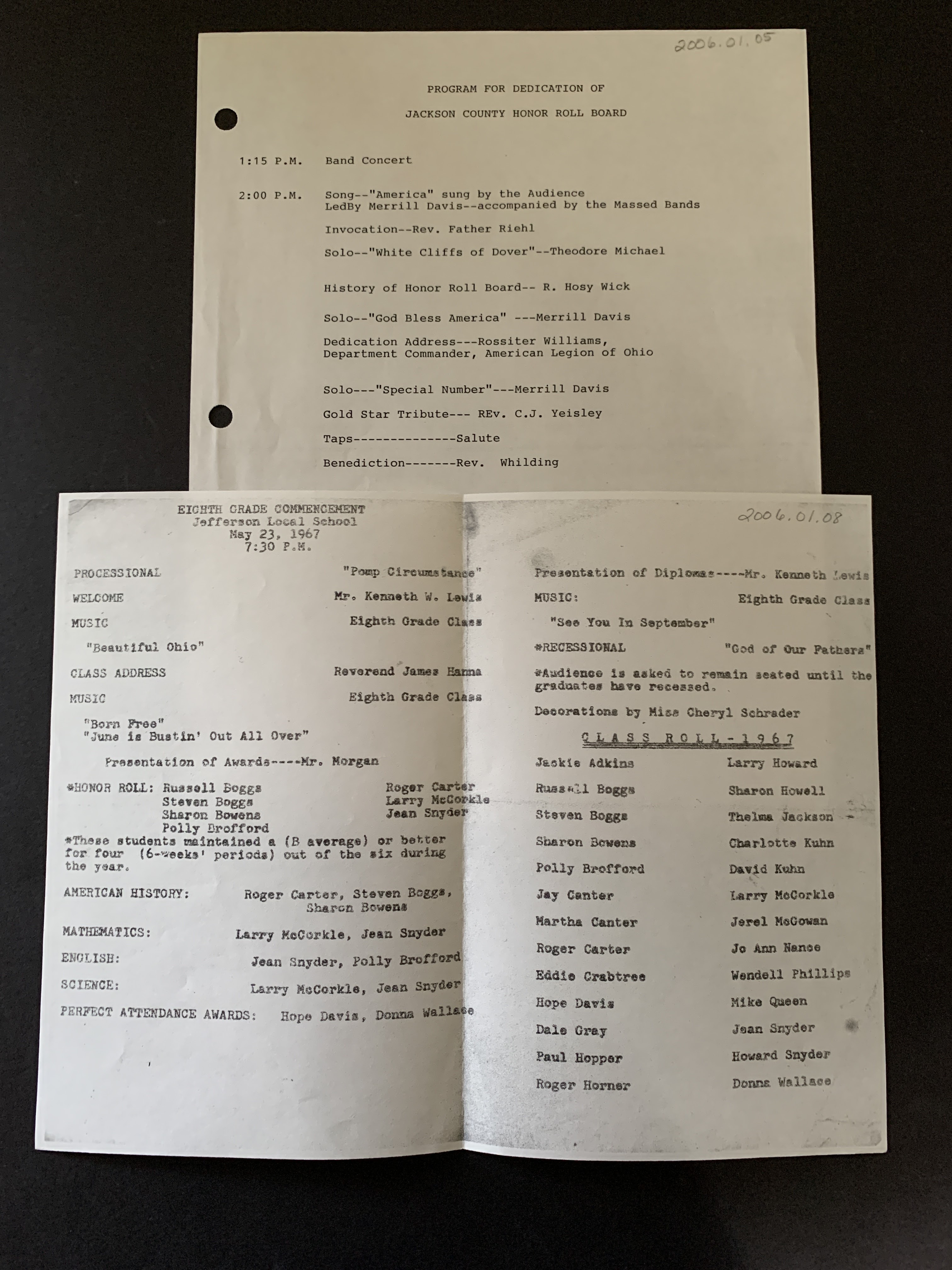 .05 undated program for dedication of Jackson County Honor Roll Board, names of participants; .08 Eighth grade commencement of Jefferson Local School, dated May 23, 1967, names of 26 graduates, school officials and Rev. James Hanna.