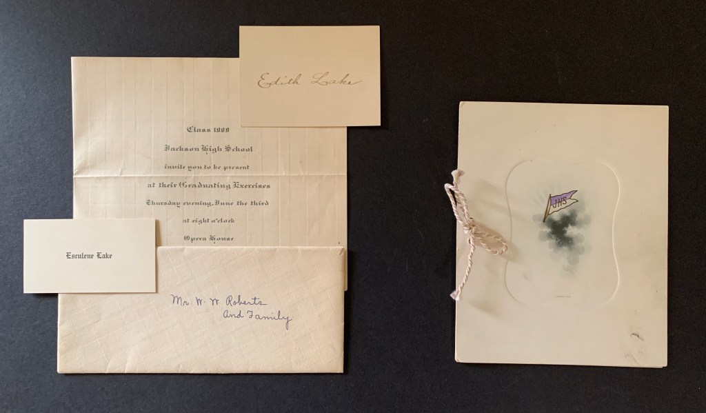 .01 1909 JHS graduation announcement (single printed paper) with four separate pieces; printed name card for Esculene Lake; handwritten name card Edith Lake; envelope addressed to Mr. W.W. Roberts and family; graduation announcement for event to be held on Thursday, June 3 at 8 p.m. at Opera House. Esculene Lake graduated in 1909. Edith Lake graduated in 1902.