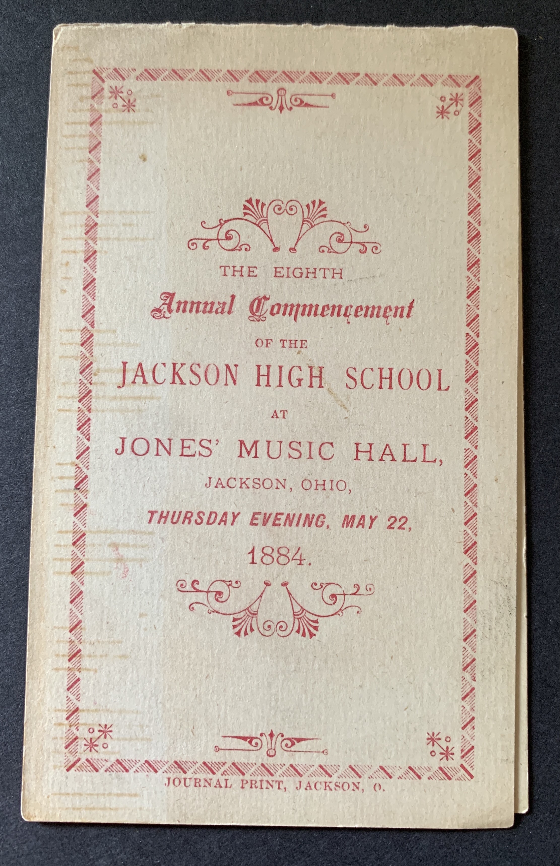 .70 front cover, red ink print, the eighth annual commencement of the Jackson High School, Thursday, May 22, 1884;