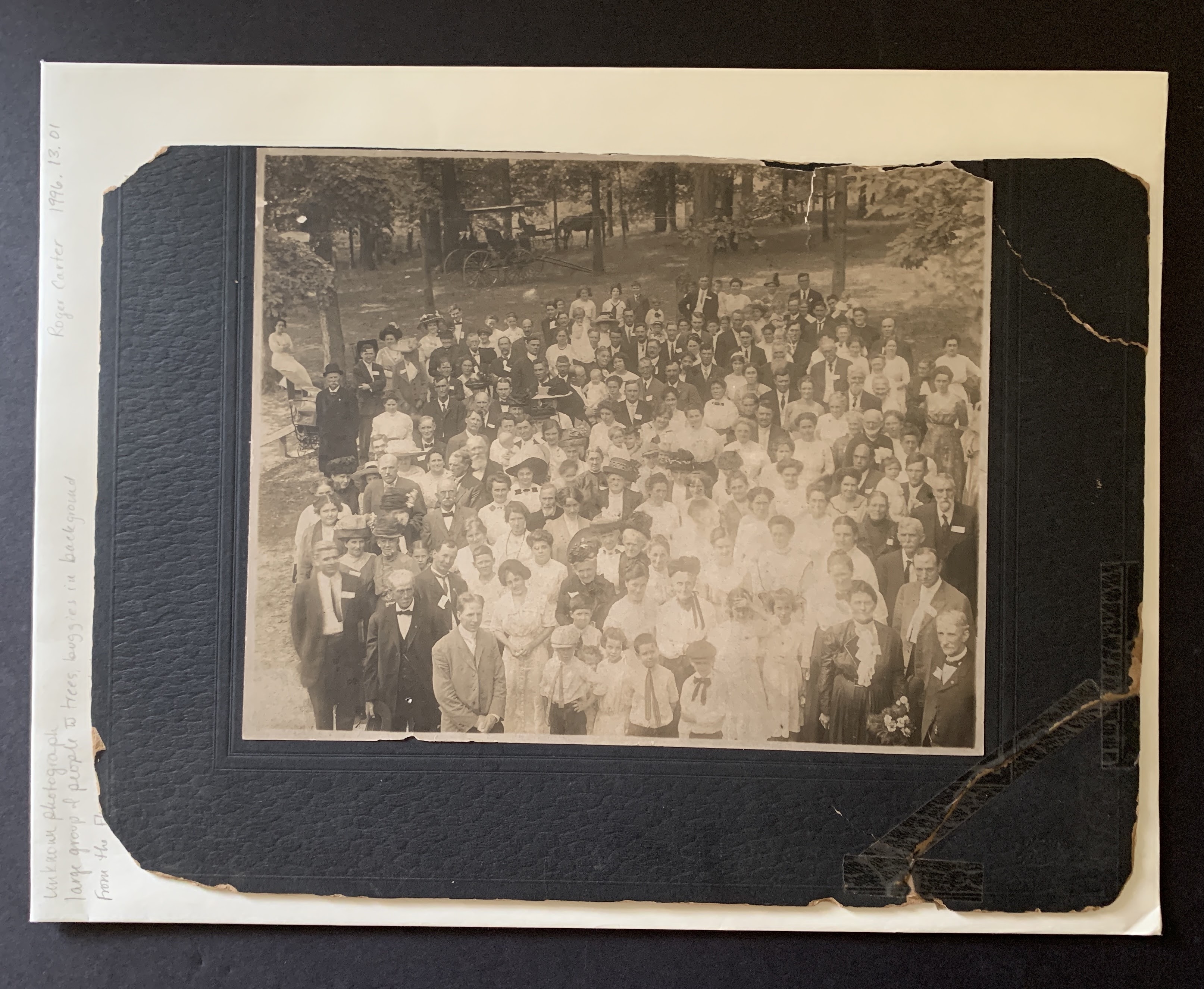 Description: oversize b/w photograph of large group of people taken outside with trees, buggy and horse, with damage to the edges of the cardboard frame backing, faint pencil marking on back of cardboard frame indicating possibly Cherrington reunion, Electric Park, with date of either 1912 or 1921.