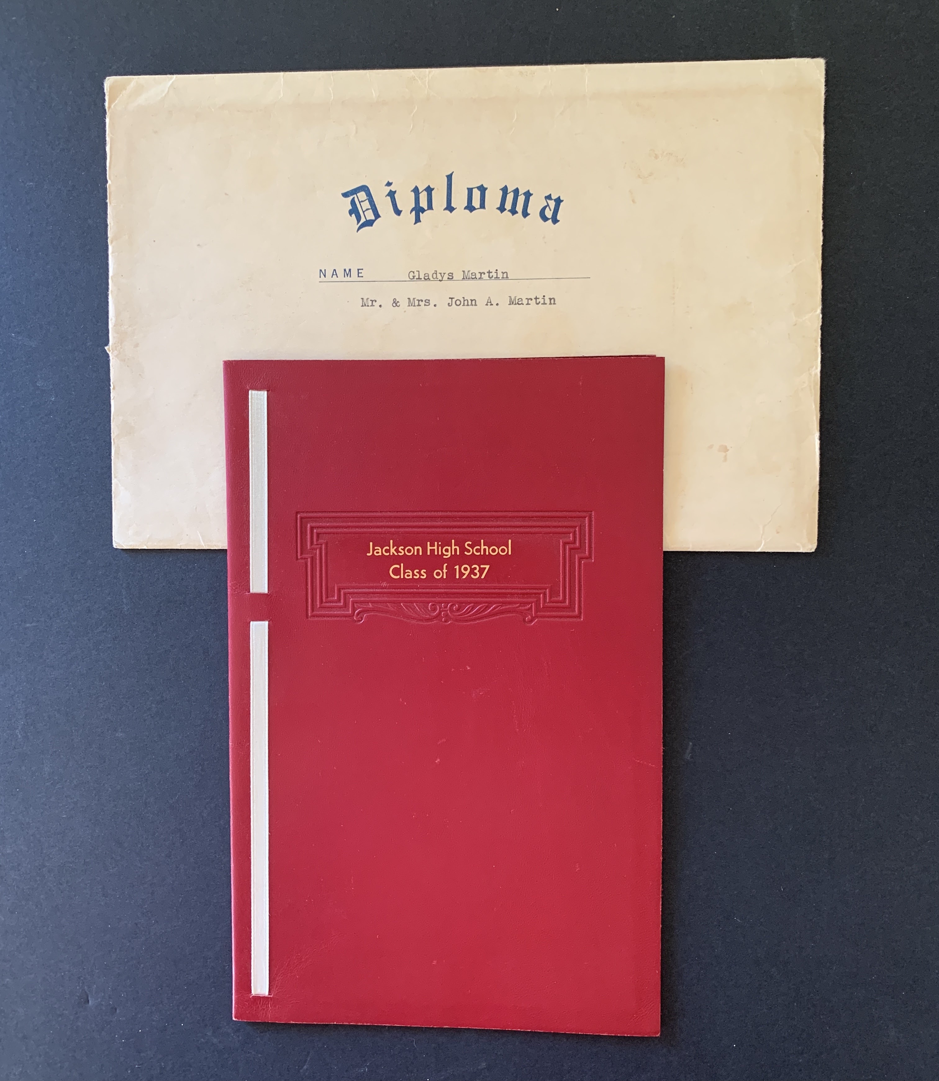 .01 cover envelope with graduate name and parent/guardian names; .02 red leather cover with gold text Jackson High School Class of 1937; .03 paper certificate diploma with name Gladys Martin, issued first day of June 1937, signed by administrators T.K. Owens, superintendent of schools, O.H.P. Snyder, principal, Charles H. Jones, president of board of education, Clyde E. Mayhew, clerk of board of education, certificate can slid out of leather cover as it is secured by white tied ribbon, slight dirt spot of diploma over Owens name (lower left corner).