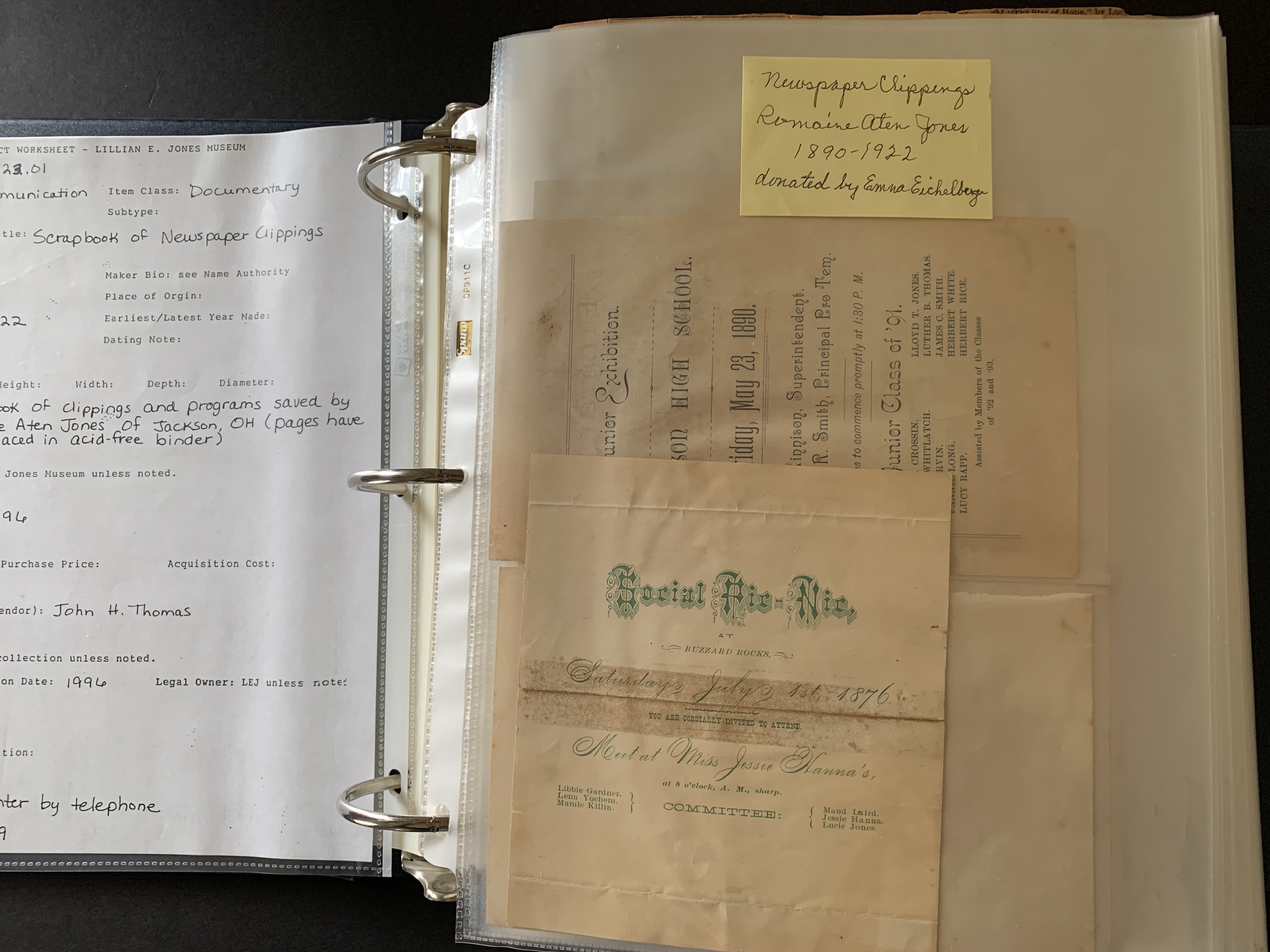Description: three ring binder (81/2×113/4 inch) containing page protected sheets of a scrapbook that belonged to Romaine Aten Jones (b.1873-d.1963). The scrapbook consists of newspaper clippings from approximately 1894-1922 predominately from Jackson newspapers, also include program booklets from various local organizations and special events.