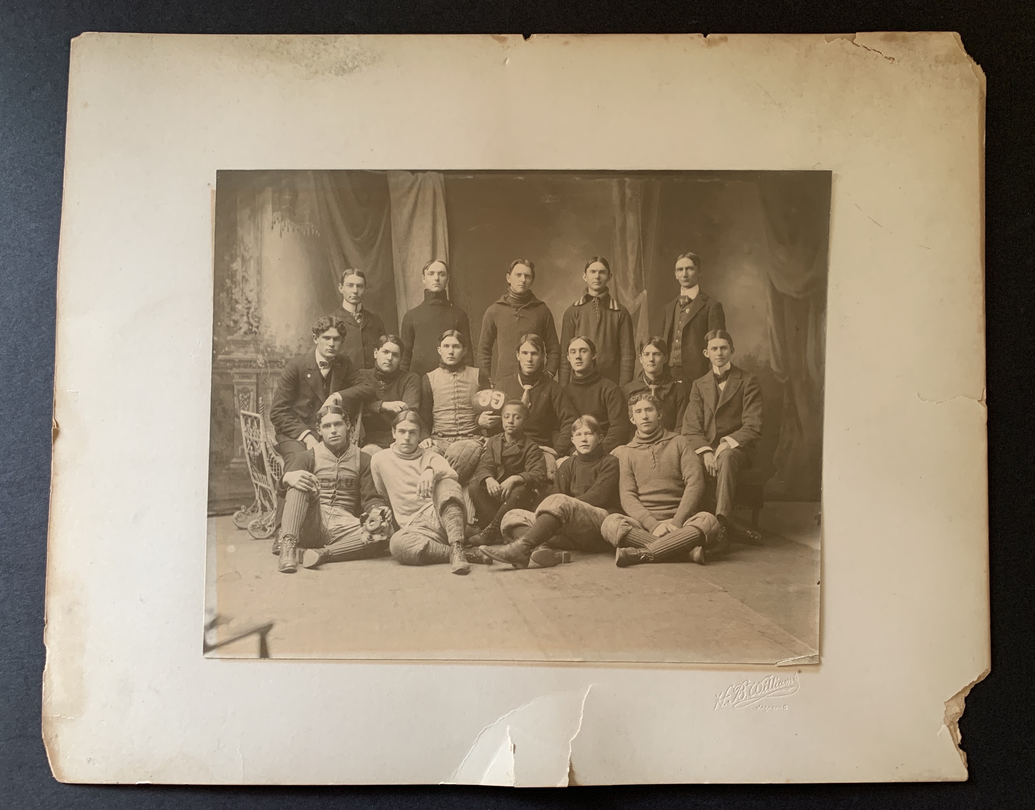 Description: b/w print, framed with cardboard, slightly tattered, 17 unnamed boys with football marked 89, three rows of boys, some in and with football gear, no certain indication of school system, photo studio mark H.B. Williams Jackson O
