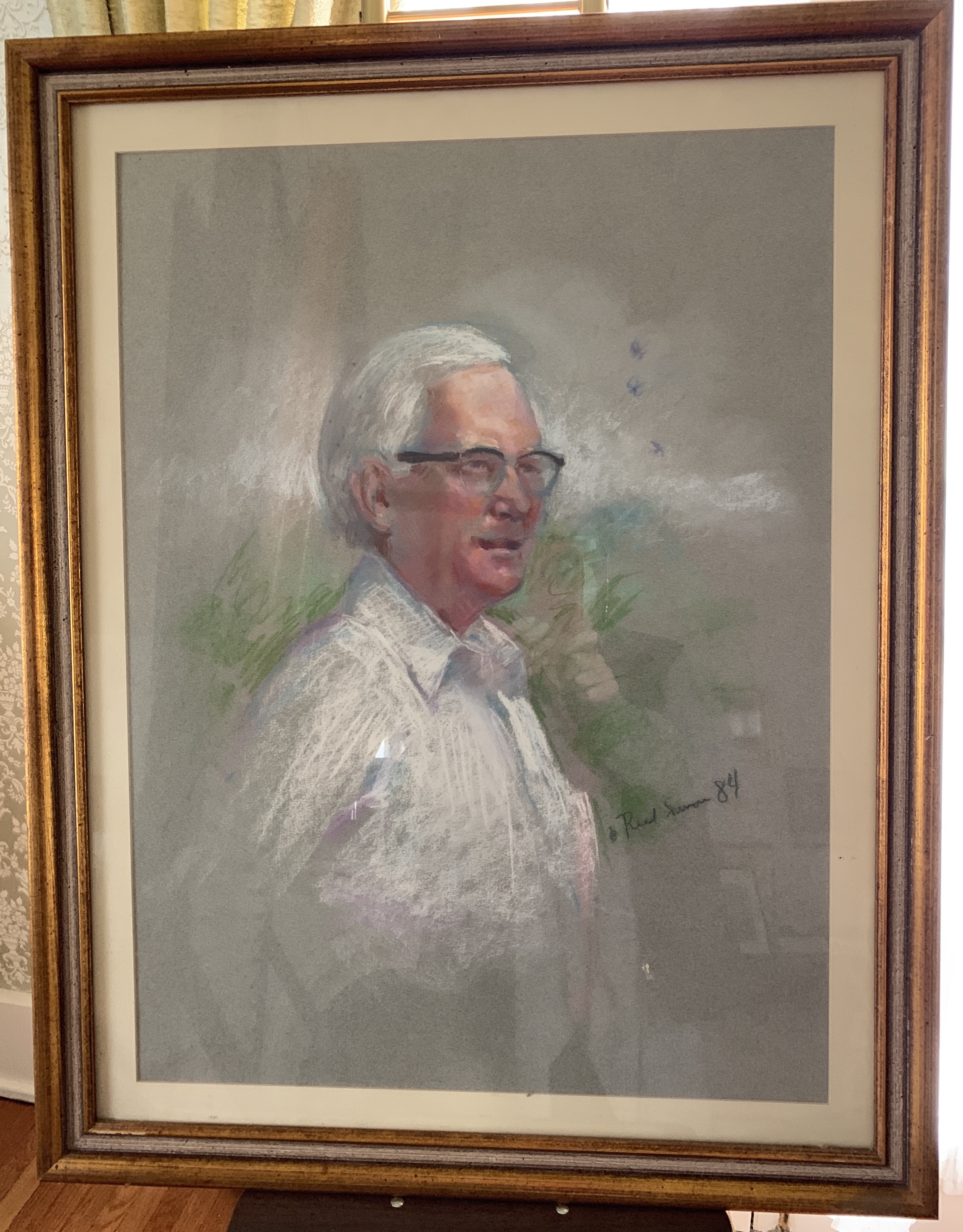 Description: portrait of Earl C. Livesay, (22in.x28in including wooden frame) colored pencil, autographed by artist done in 1984, father of Fred and Hugh Livesay and husband of Ann Schellenger.