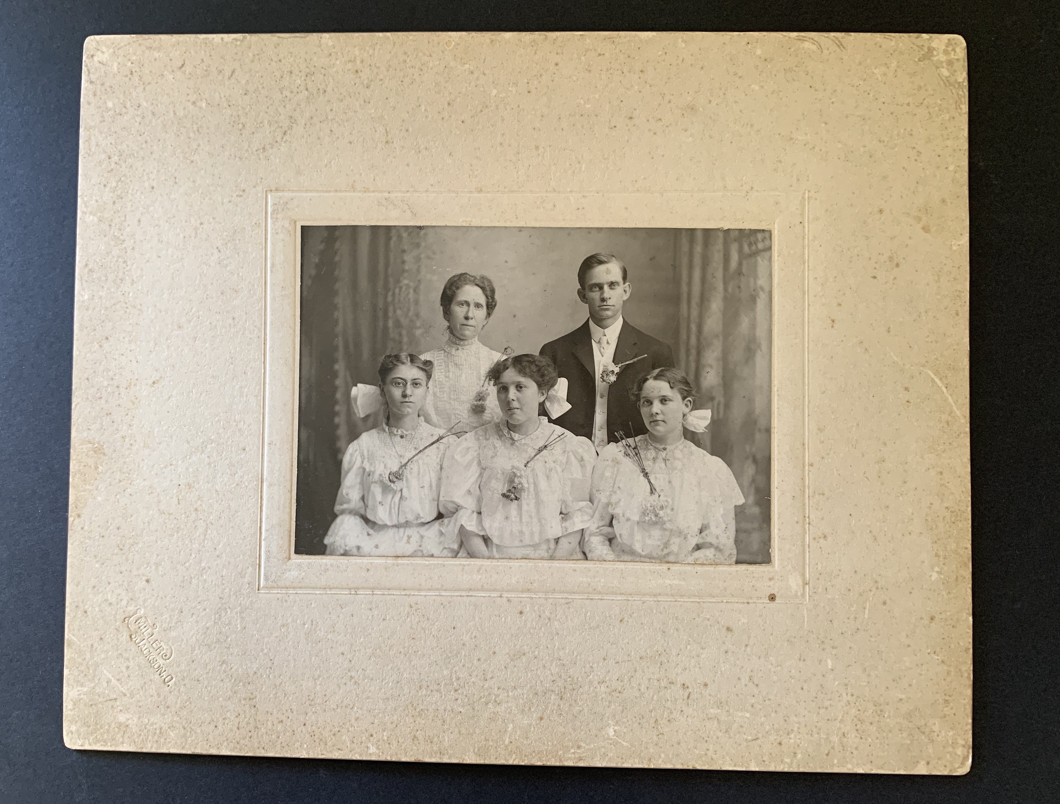 Description: black and white framed photo (11×13 paper frame), undated and unknown photo of two adults(female and male) and three girls all white large white bows in hair and all people wearing ‘dress clothes’ with flowers and flowerstems attached to clothing, all flowers facing left. Left side of frame is embossed ‘Miller Jackson O.’;