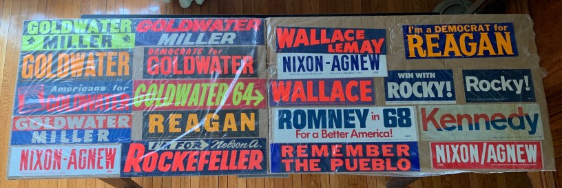 .42: cardboard with 10 bumper stickers lightly affixed: a.Goldwater/Miller (blue/yellow), b. Goldwater (blue/orange), c. Americans for Goldwater, d. Goldwater/Miller (red/white/blue), e. Nixon/Agnew, f. Goldwater/Miller (neon orange/blue/white), g. Democrats for Goldwater, h. Goldwater ’64, i.Reagan, j. I’m for Nelson A. Rockefeller.