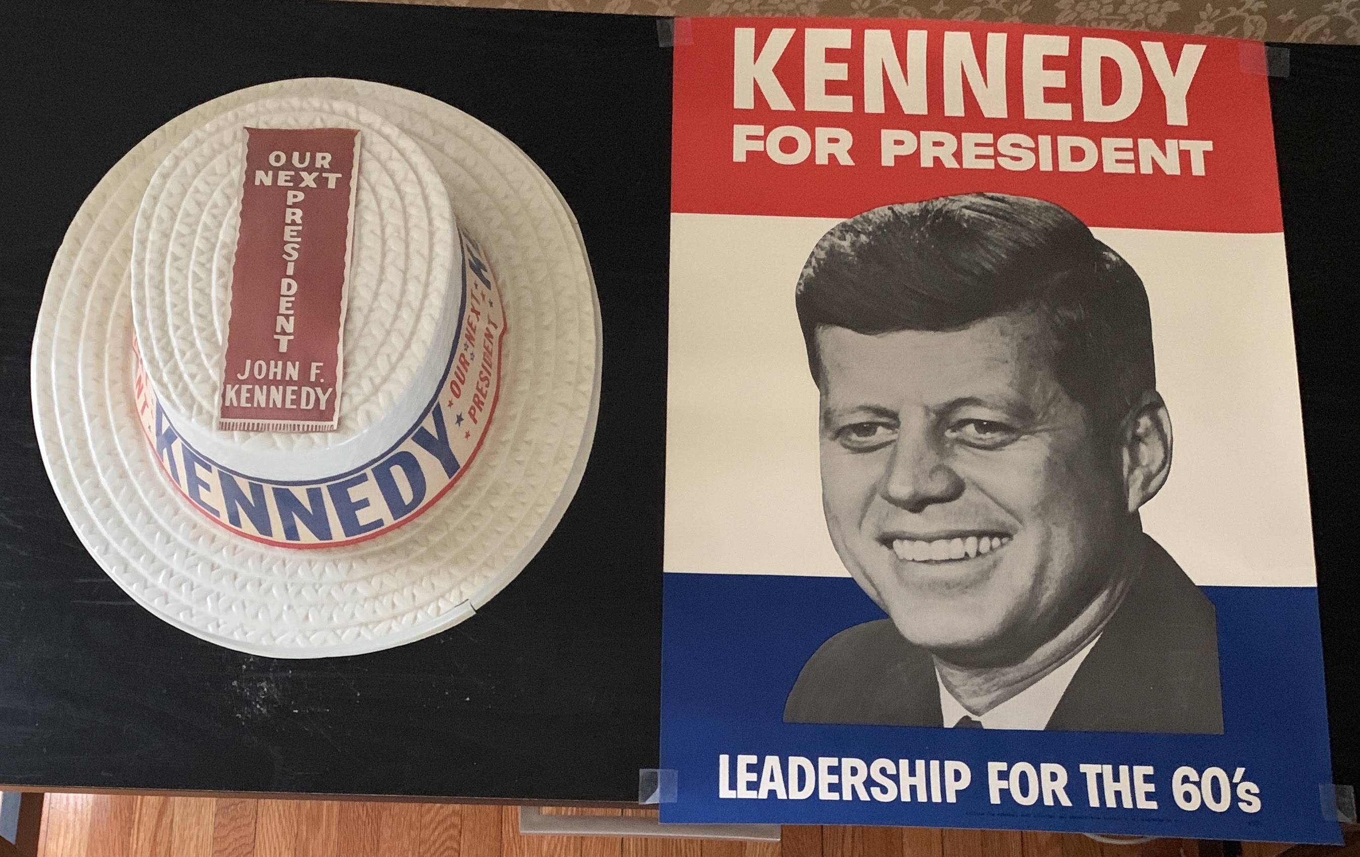 .45: thin white plastic hat with paper band ‘Kennedy for President’; .57: six paper posters with JFK photo and statement “Kennedy for President/Leadership for the 60’s.