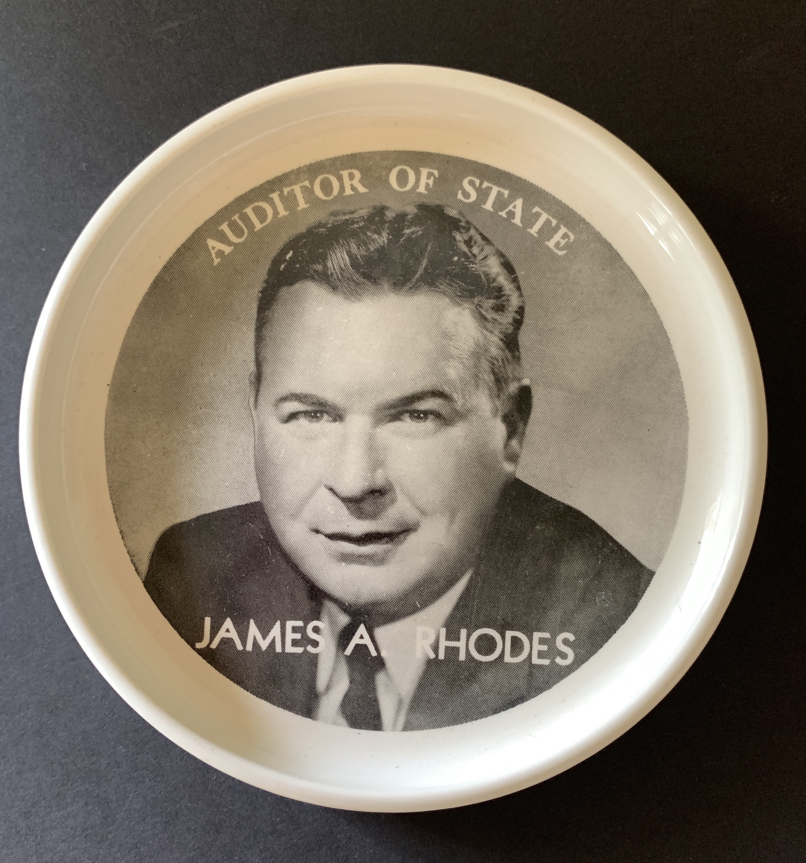 Description: 0.12 ceramic plate with rim, b/w photo of James A. Rhodes, white text Auditor of State and name.