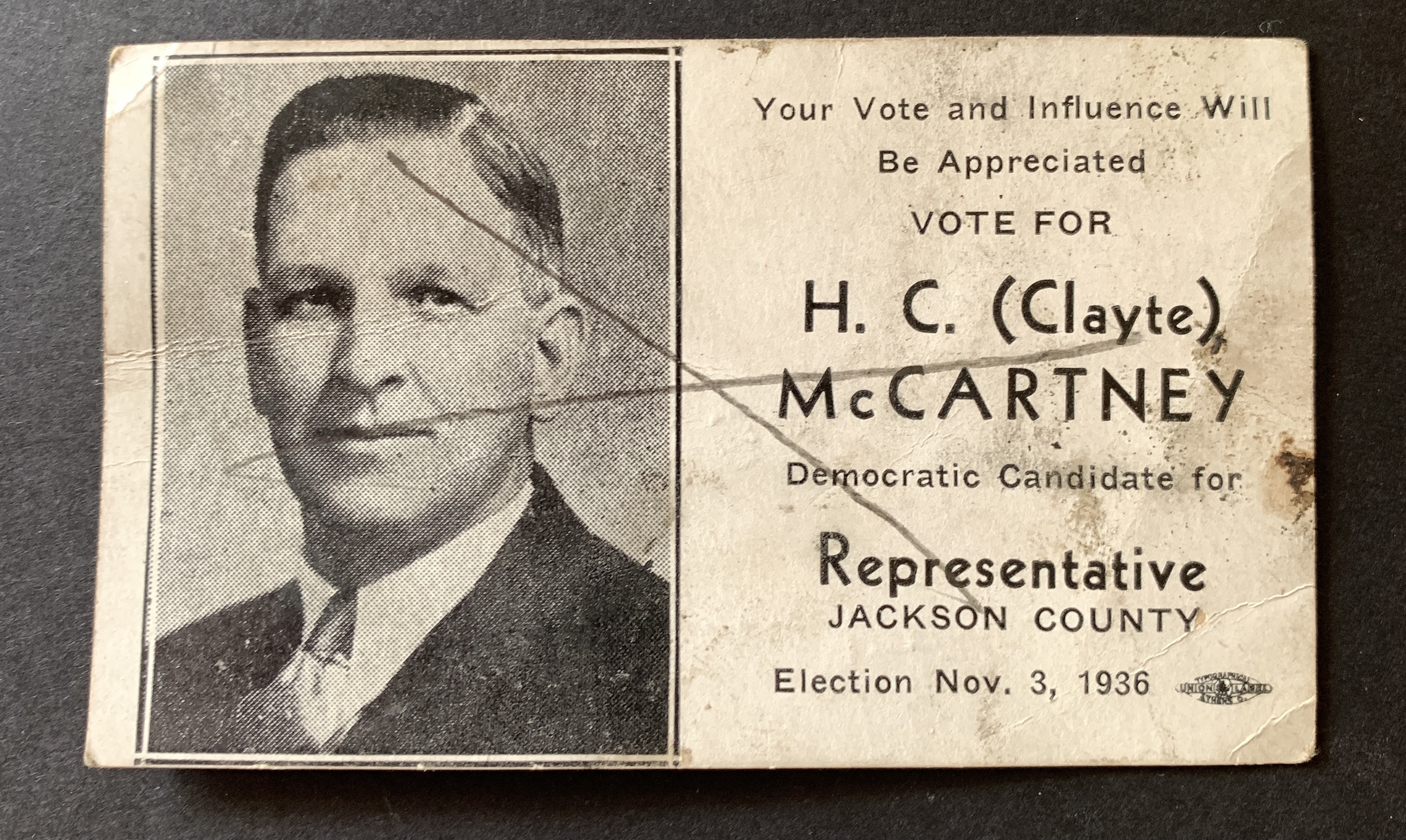 Description: one yellowed business card (.29) with black text and b/w photo H.C. (Clayte) McCARTNEY Democratic candidate for Representative Jackson County Election Nov.3, 1936 with union printing ‘bug’ in lower right corner, pencil X over the text, backside with penciled notes and names ‘To Christina Hayes’ and $1.05.
