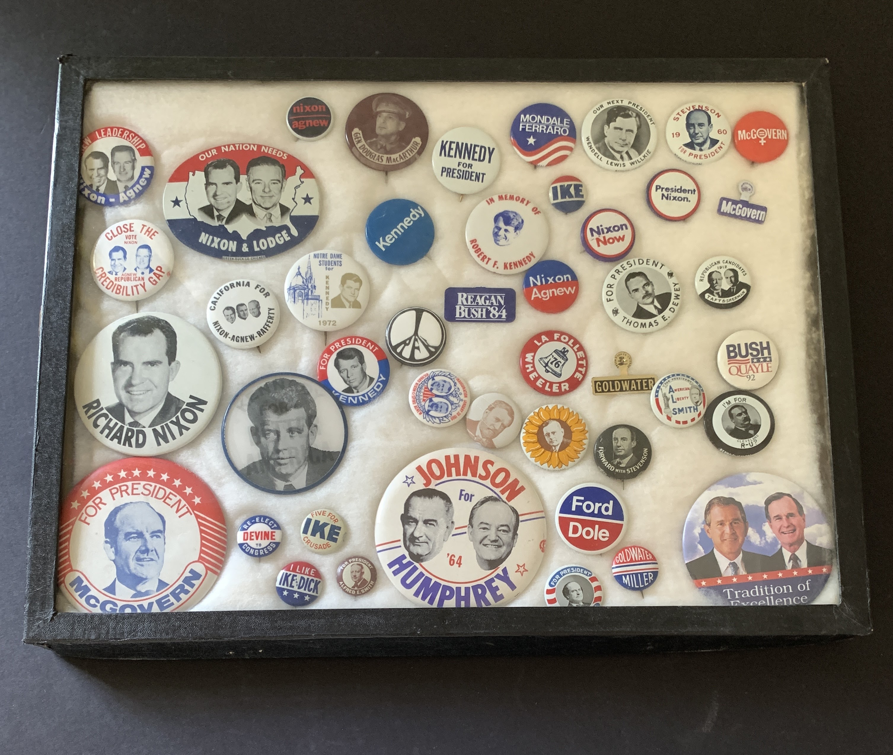a. New Leadership (Nixon/Agnew), b. Notre Dame Students for [Ted]Kennedy 1972, c. General Douglas MacArthur, d. Kennedy (blue), e. Close the Credibility Gap-Republian (Nixon/Agnew), f. Inauguration, January 20, 1969 Richard Nixon and Spiro Agnew, g.[Robert] Kennedy for a Better America (hologram type), h. IKE (red, white,blue), i. Five for Ike, j. [Robert] Kennedy for President, k. California for Nixon-Agnew-Rafferty, l. I like Ike and Dick, m. RFK (peace sign), n. Re-Elect Devine to Congress, o. Kennedy for President, p. In Memory of Robert F. Kennedy.