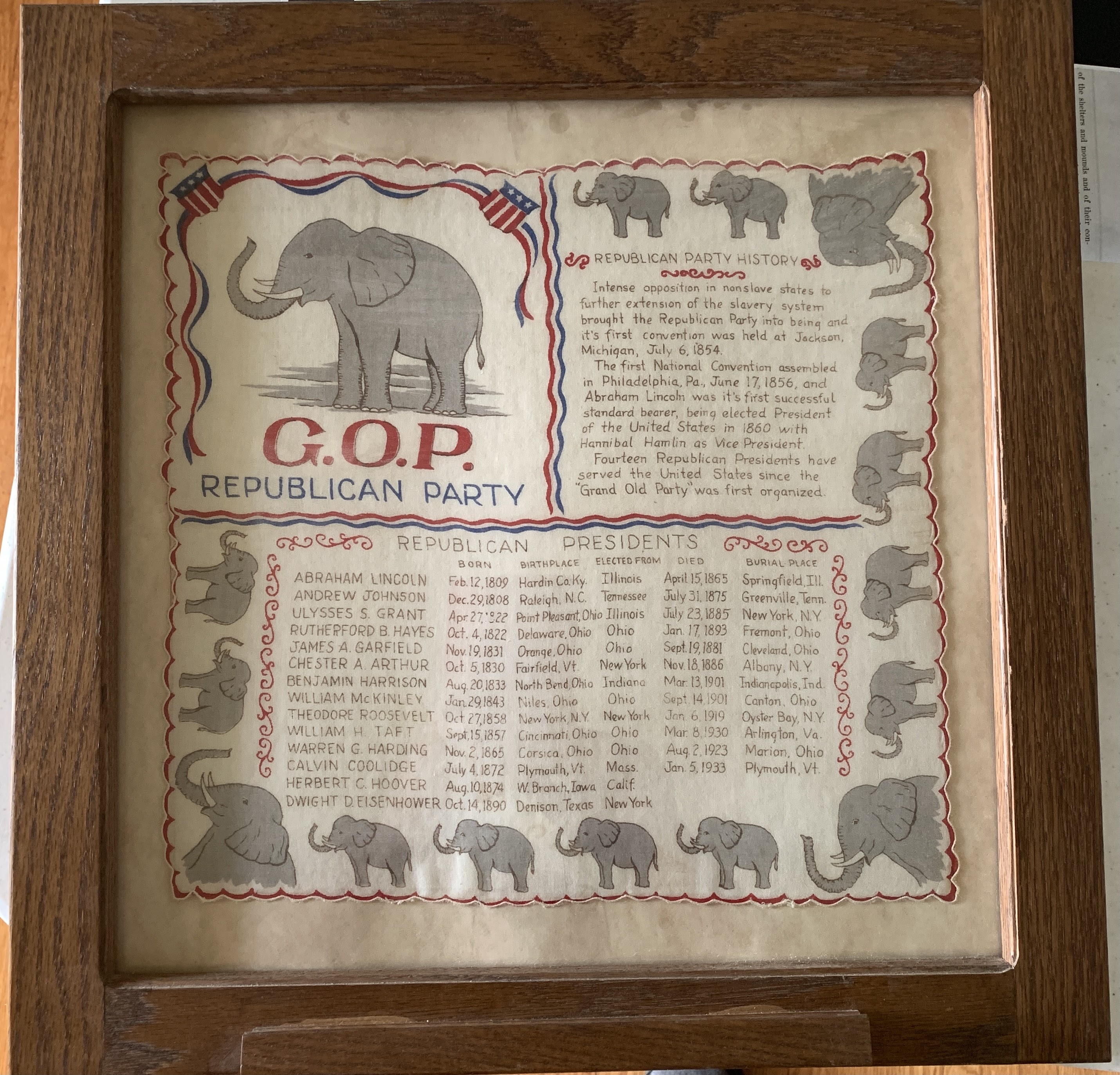 Description: framed, oak frame with pencil ledge, handkerchief of GOP Republican Party with elephants and listing of Republican presidents from Abraham Lincoln to Dwight D. Eisenhower (Hoover and Eisenhower’s death dates not listed).