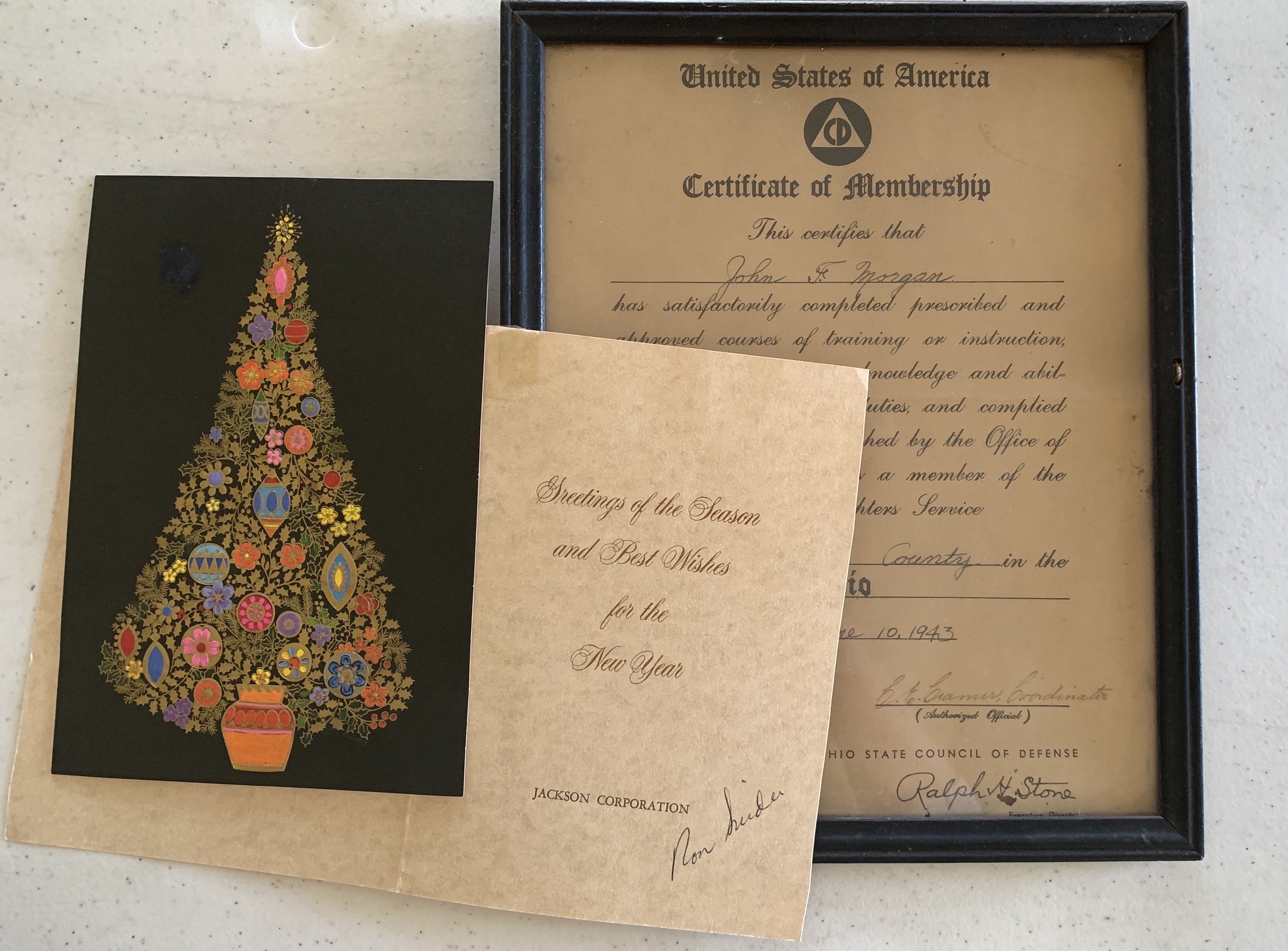 .01 Season’s Greetings card, beige paper with green wreath, gold bow and red ink on front, inside is beige ink and signed by Ron Sheider (?); .02: black card with multicolored Christmas tree on front, inside beige with red ink of Jackson Corporation, signed by Ron Sheider (?), neither card dated; .03: framed certificate for John F. Morgan from United States of America Civilian Defense Certificate of Membership in the Forest Fire Fighters Service of Jackson County Ohio dated June 10, 1943.
