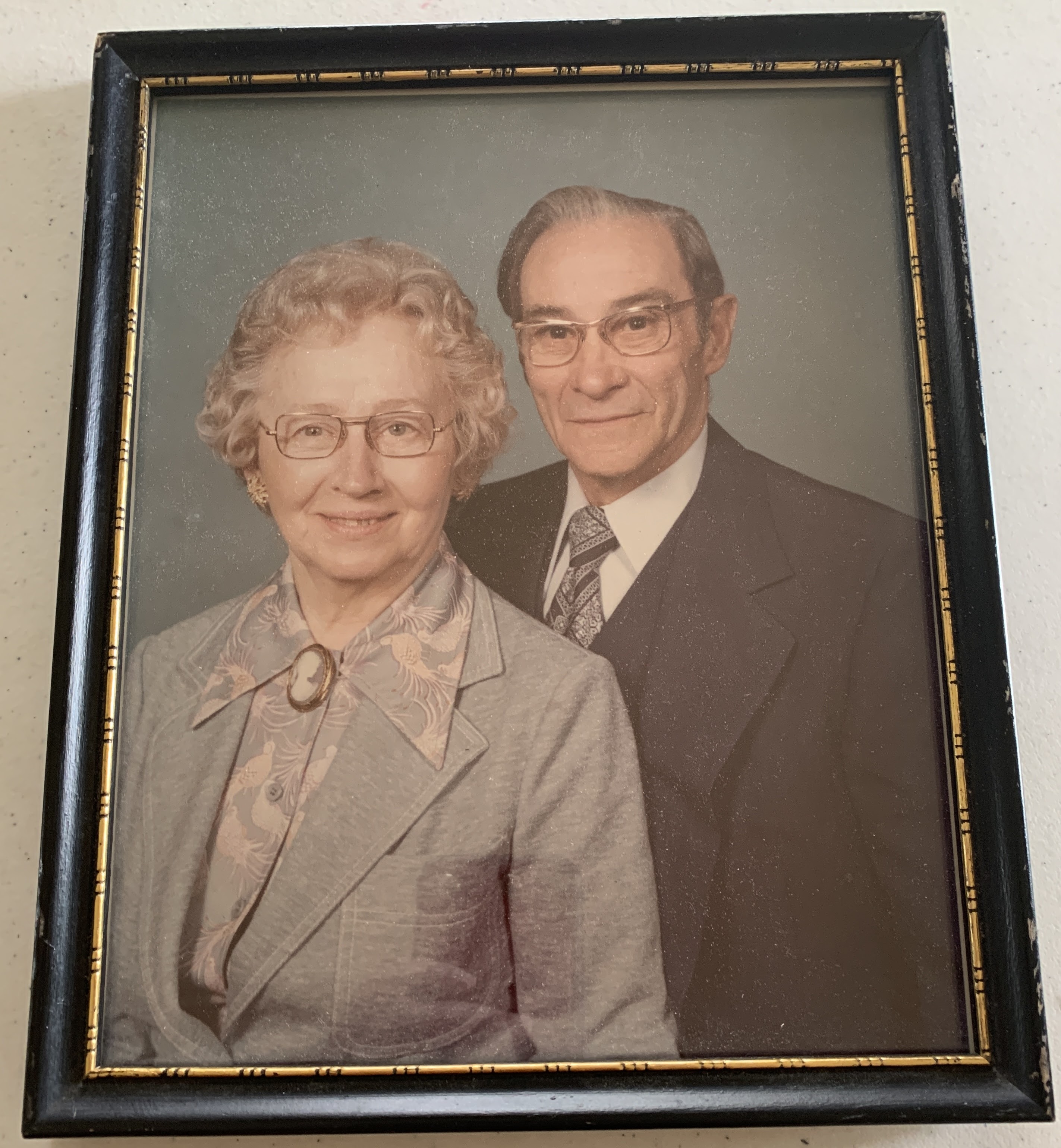 .01: colored photograph of Margaret and her husband Melvin Shelton who lived on Trago Ave. Also a sister to Peggy Fite of the Fite Yarn Shop in Jackson .02: variegated red, white, blue knitted sweater; .03:cream-colored wool knitted coat; .04: variegated gray knitted wool coat; .05a&b: variegated blue wool knitted coat, variegated blue wool knitted skirt; .06a&b: variegated maroon knitted jacket and skirt; .07a&b: pink knitted sweater and skirt; .08: variegated brown/gold cardigan knitted sweater; .09: knitted tan sweater vest made by Edna Tackett; .10a&b: variegated gold knitted sweater and pants; .11: yellow knitted dress; .12a&b: variegated blue knitted sweater and skirt.
