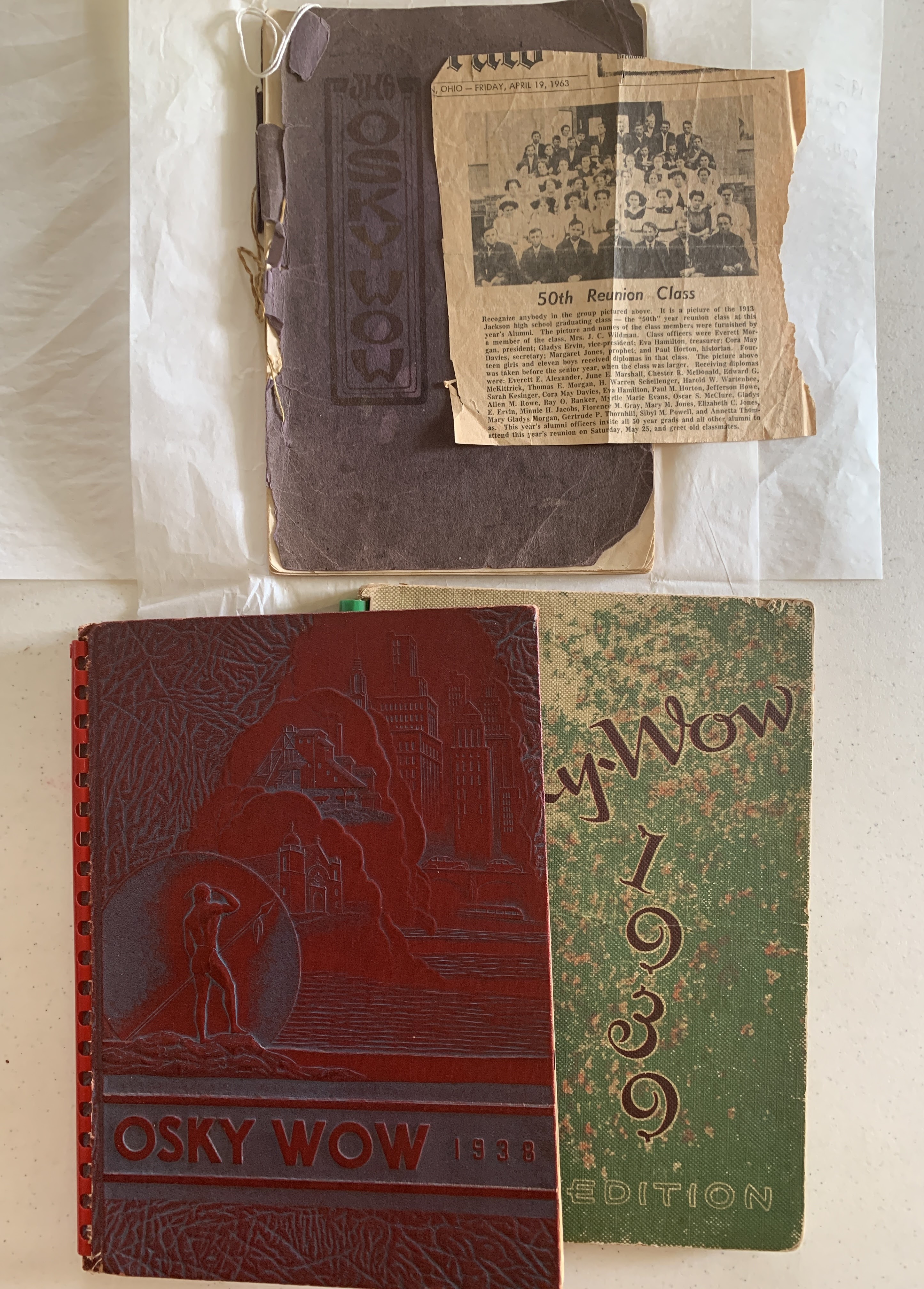 .01: THEN AND NOW, A brief history of Jackson, 1976, by Katherine Stevenson Sheward, b/w paperback; .02: Ohio’s Capitols compliments of your congressman, no date, full color, stamped by Homer E. (Pete) Abele, 10th district of Ohio, (Abele b. 1916 Wellston-d.2000 Hamden) Served as a (R) in 1949-1952 and 1963-1964; .03: Osky Wow 1912 and a 1963 newspaper clipping of the 50th reunion for the class of 1913 with names, donor was the daughter-in-law of Sarah Kesinger Wildman was who a 1913 graduate; .04: Osky Wow 1938 red cover; .05: Osky Wow 1939 Apple Edition, donor was widow of James Michael Wildman, JHS graduate 1940.