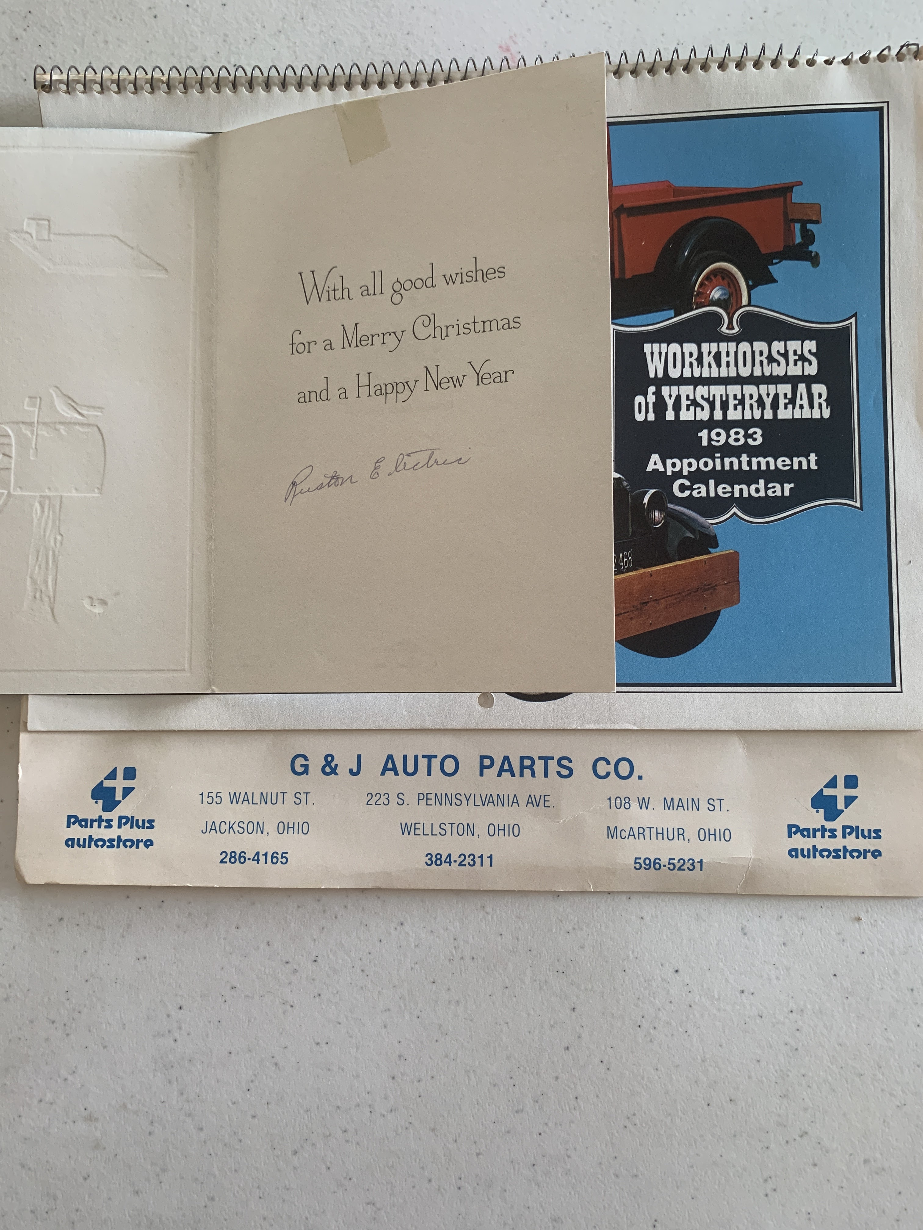 Description: local businesses in Jackson County; .01: undated Christmas card signed Ruston Electric, donor says he was a high school employee there in 1974; .02: 1983 calendar as promotional advertising for G & J Auto Parts Co. which was a Parts Plus Autostore with locations in Jackson, Wellston, and McArthur.