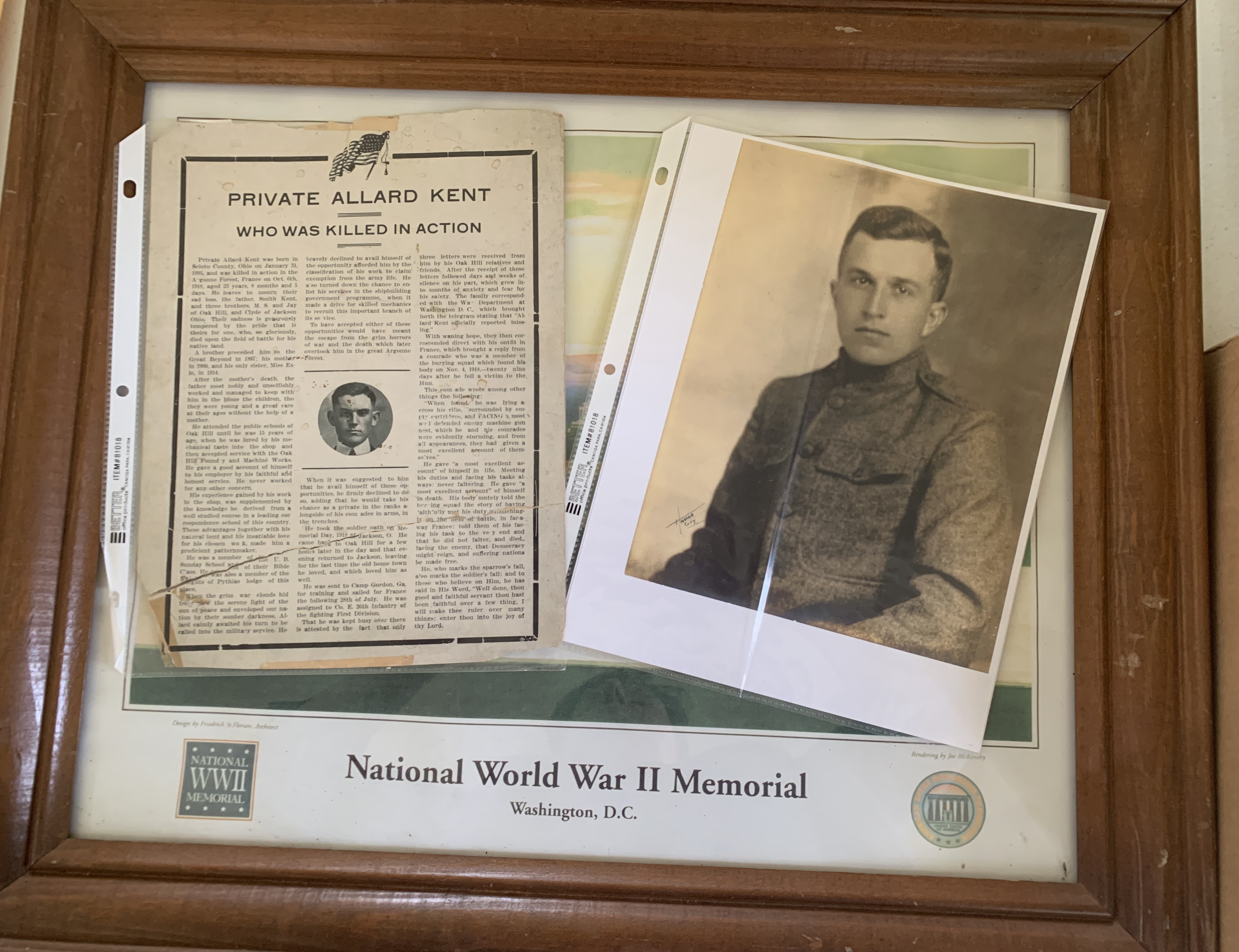 .10: copy of funeral program for Oak Hill man Lt. Col. Stanley E. Corvin 1922-2002; .11: copy of photograph of Oak Hill man Harry Metzler b. 1890-d KIA 1918; .12: copy of War Records of Harry Hetzler; .13: FRAGILE, torn biography of Oak Hill man Private Allard Kent b. 1895-d. KIA 1918; .14: wood framed copy of WWII Memorial photo landscape of Memorial in Washington D.C.