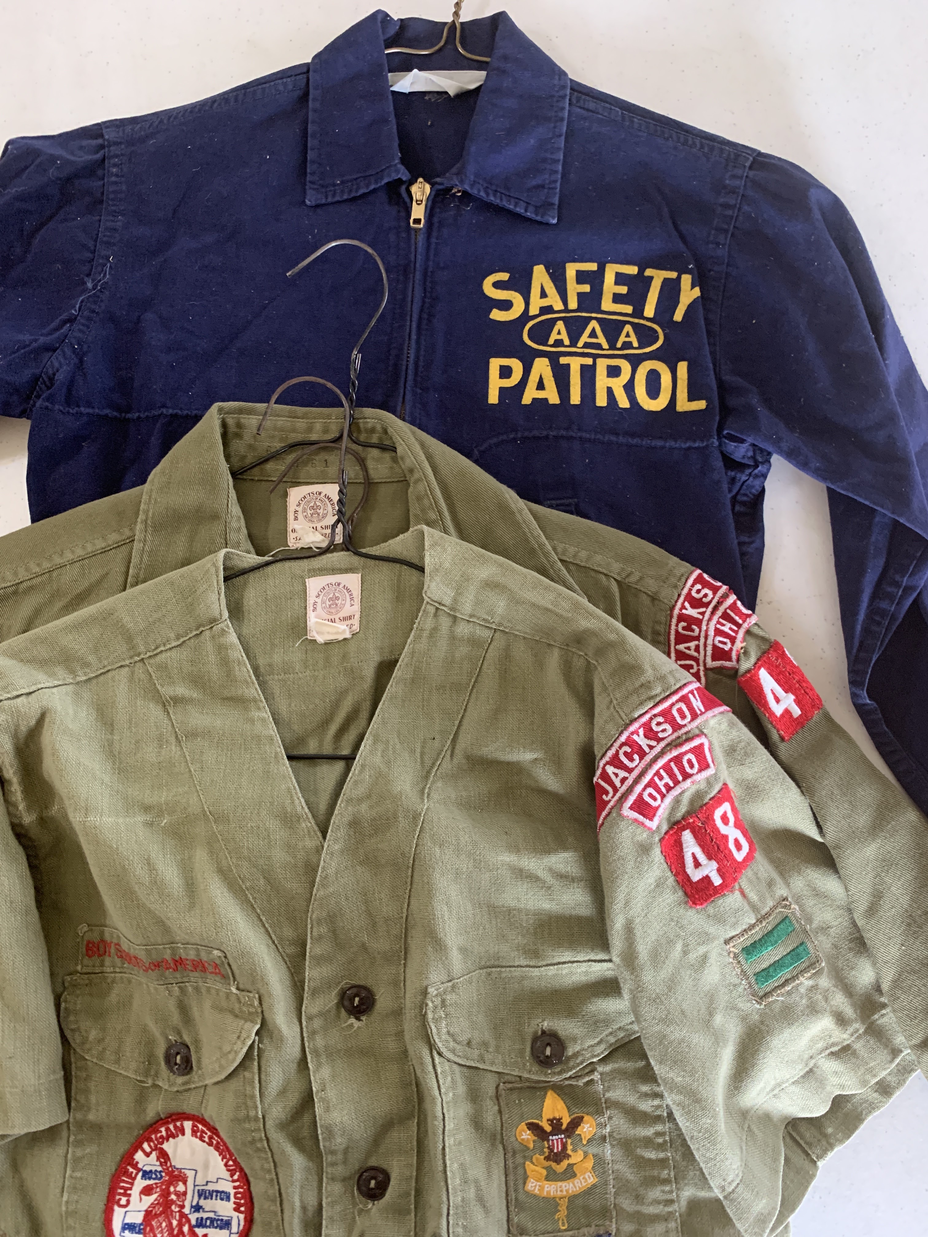 Description: 3 items Boy Scouts of America and 1 item AAA Safety Patrol; .20: one blue cotton jacket with gold metal zipper and yellow lettering Safety Patrol AAA, likely from Parkview Elementary School; .21: BSA olive green short sleeve uniform shirt with badges Jackson Ohio 48, Chief Logan Reservation circle badge and 3 other sewn on badges; .22:BSA uniform long sleeve shirt with badge Jackson Ohio 48; .23: BSA uniform pants, olive green, no badges, no size.