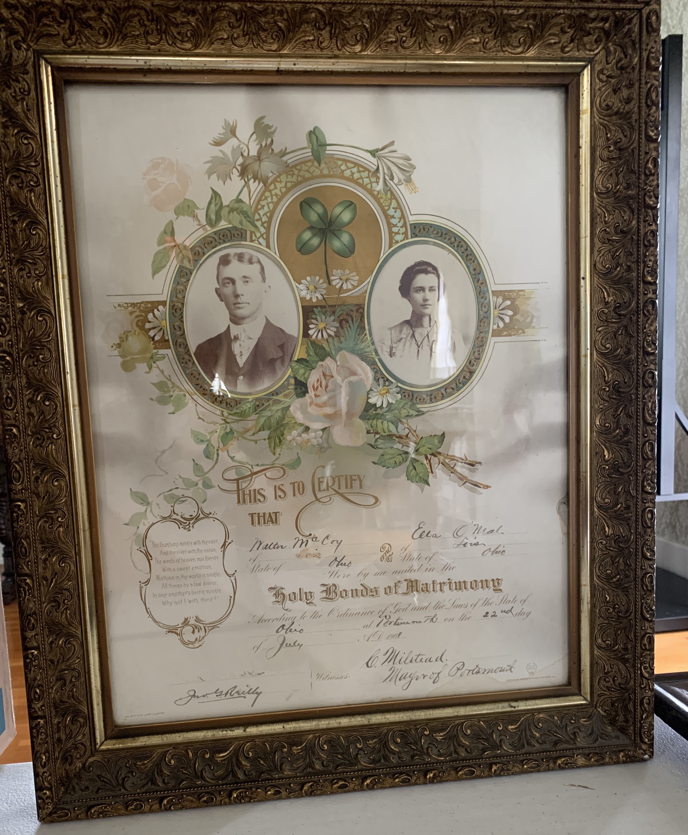 Description: four scrapbooks previously belonging to Faye McCoy including her accomplishments and some family photos and clippings, marriage certificate for Walter McCoy and Ella O’Neal (Faye’s father and mother), photograph of Mr. and Mrs. O’Neal who were Faye McCoy’s maternal grandparents.
