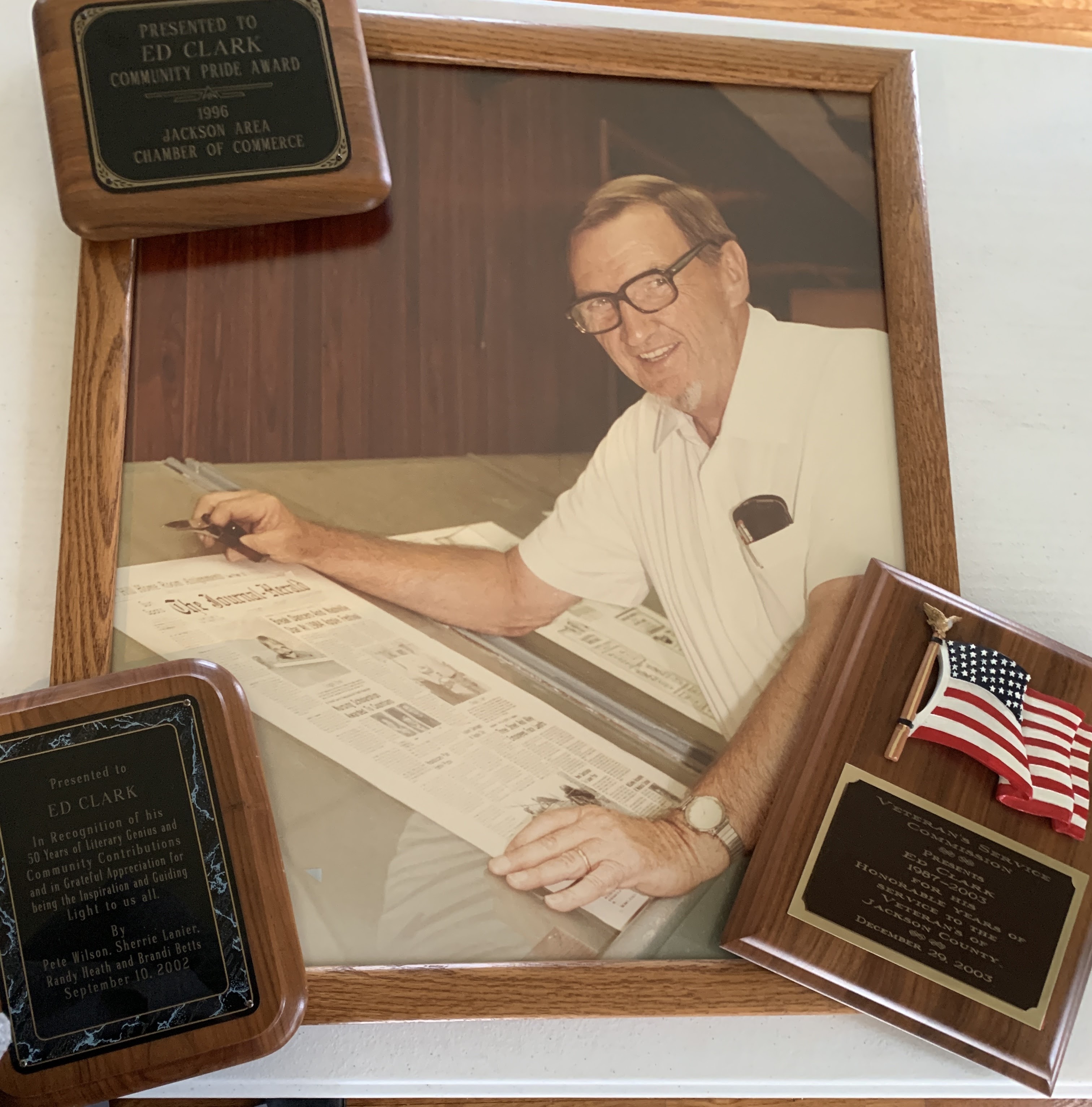 Description: photo of and plaques from Ed Clark, longtime Jackson newspaper editor