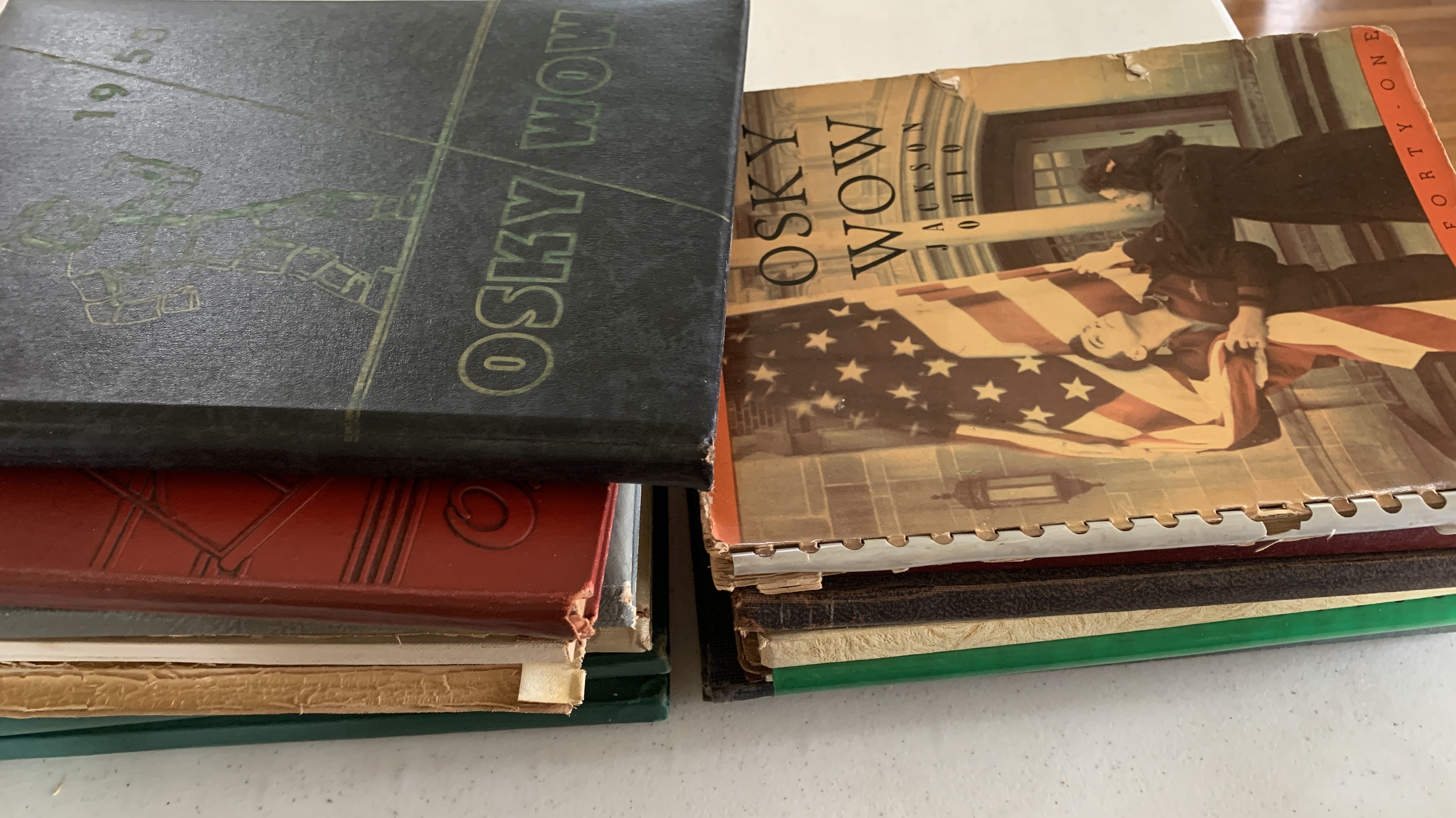 Description: individual Osky Wow yearbooks of Jackson High School with one newspaper clipping of 25th anniversary of Class of 1958.