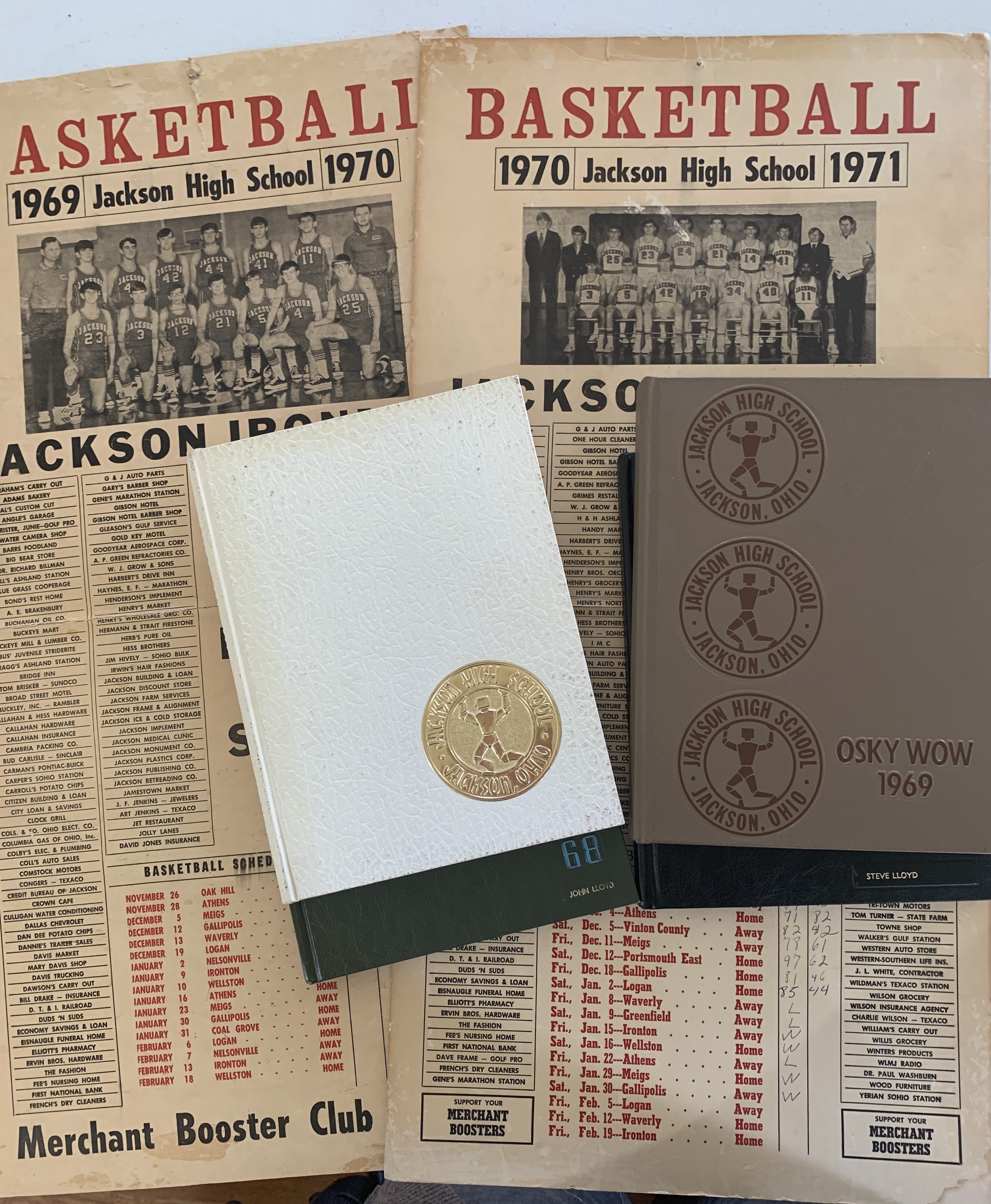.100: 1970-1971 cardboard schedule with boys team photo; .200: 1969-1970 cardboard schedule with boys team photo; .103: 1941 Rio Grande College yearbook the Grandion; .104: 1940 Rio Grande College yearbook, the Grandion; .105: 1939 Rio Grande College yearbook, the Grandion; .106: 1966 Jackson HS Osky Wow; .107: 1968 Jackson HS Osky Wow with gold name John Lloyd on cover; .108: 1969 Jackson HS Osky Wow; .109: 1970 Jackson HS Osky Wow with gold name Steve Lloyd.