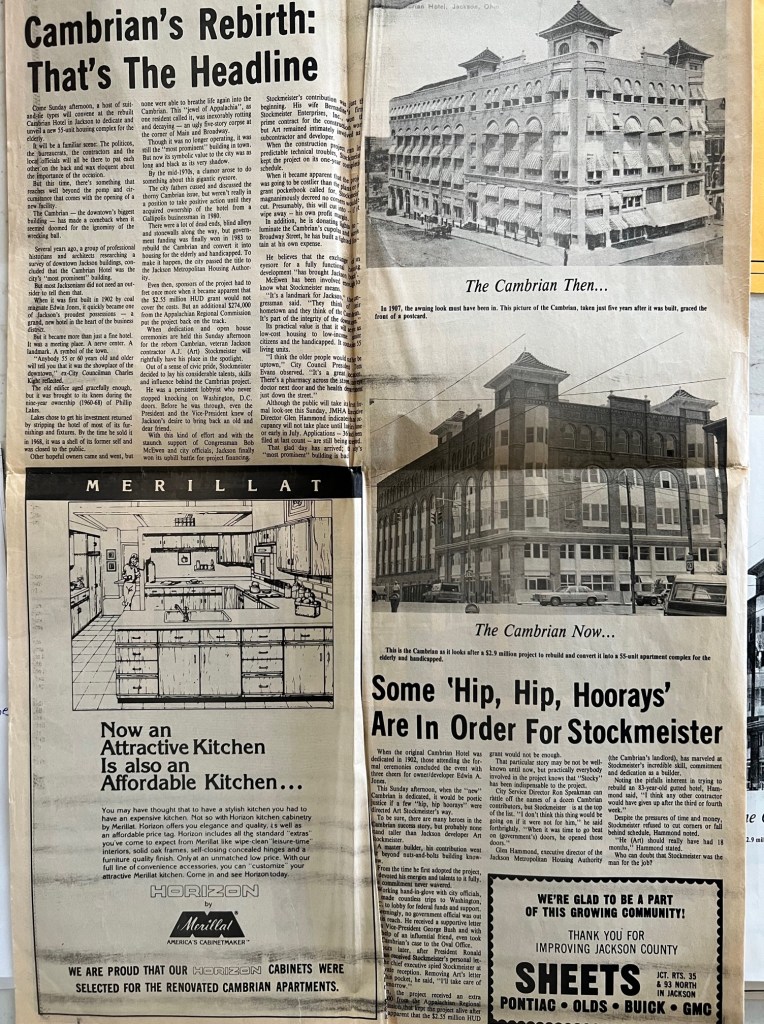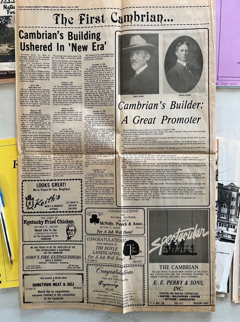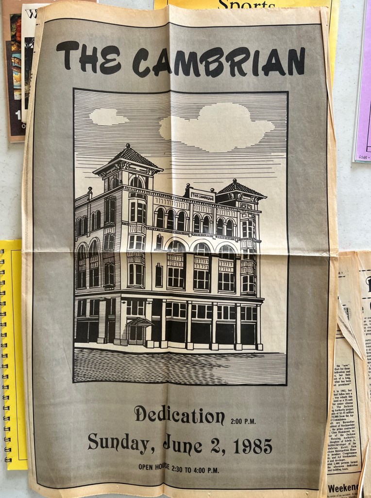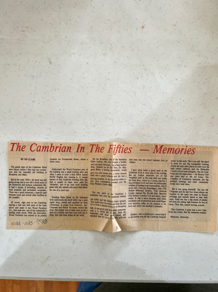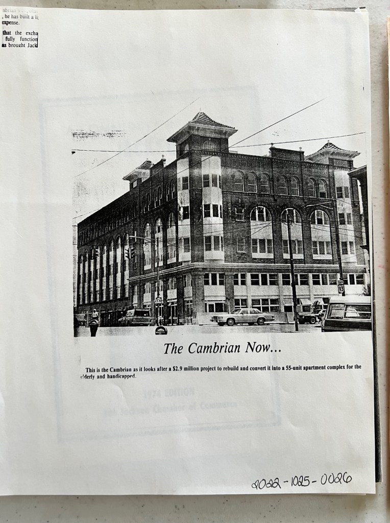 Items: 0026: Cambrian Hotel picture printout; 0027A-D: Special edition of The Journal-Herald from 1985 about The Cambrian; 0028: Ed Clark column from Journal-Herald about The Cambrian in the 1950s.