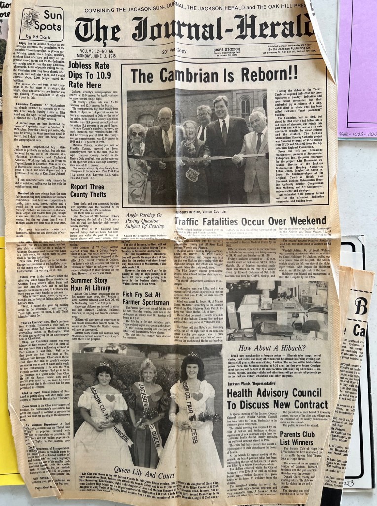 Description: The first image is a print out of The Cambrian after its renovation. The second through the fourth images are from the special edition of the Journal-Herald in 1985 celebrating the reopening of the Cambrian. The fifth image is from an Ed Clark column in the Journal-Herald detailing memories of The Cambrian from the 1950s.