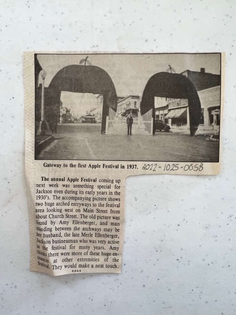 Items: 0058: News clipping showing the gateway from the 1st Apple Festival in 1937; 0076: 1980 Apple Festival program; 0077: 1984 Apple Festival Program; 0079: Article on business of apple orchards in Jackson County.