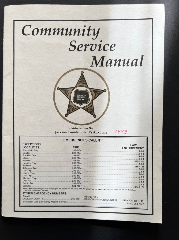 The second item is a community service manual from 1993 published by the Jackson County Sheriff’s Auxiliary. It details government resources related to emergency services, drug abuse, child abuse and neglect, AIDS and crime prevention. The manual also contains ads for many Jackson County businesses – including some that are no longer in business.