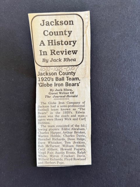 The third item is a news clipping from The Journal-Herald discussing the Globe Iron Company’s semi-professional football team know as “The Bears” in the 1920s.
