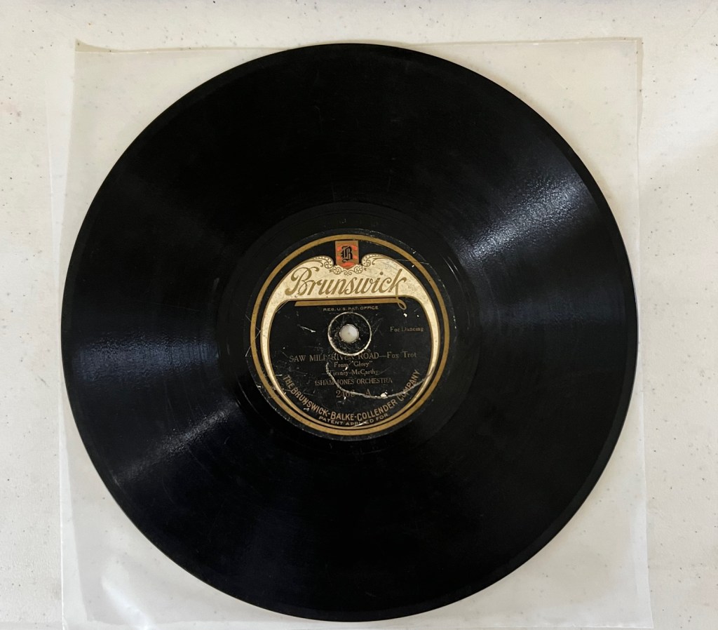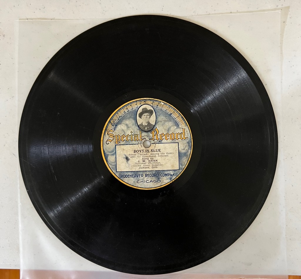 Description: The first item is an EP from the Isham Jones Orchestra in 1923. Side A plays “Saw Mill River Road” and Side B plays “Farewell Blues”. The EP was published by The Brunswick-Balke-Collender Company. Both songs are for a Fox Trot. The second item is an EP from J.W. Hank. The release date is unknown. Side A plays “Boys in Blue and Side B plays “The Old Flag Never Touched the Ground Boys”. The EP was published by the Rodeheaver Record Company from Chicago. J.W. Hank was born in West Virginia and served in the American Civil War. He died in Jackson, OH on November 7th, 1925 and is buried in Fairmount Cemetery.