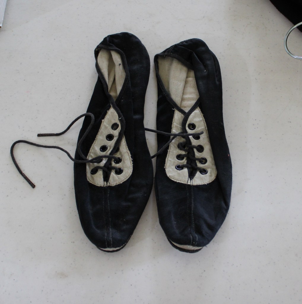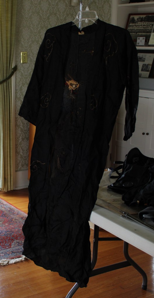 Description: The first two pictures are of women’s bathing suits from sometime between 1900-1915. The third picture is of women’s swim shoes that would have been worn with the swimsuit. The fourth is a jumpsuit loungewear coverup with Japanese-inspired detailing. The fifth picture is a robe-style loungewear coverup that also has Japanese-style detailing.