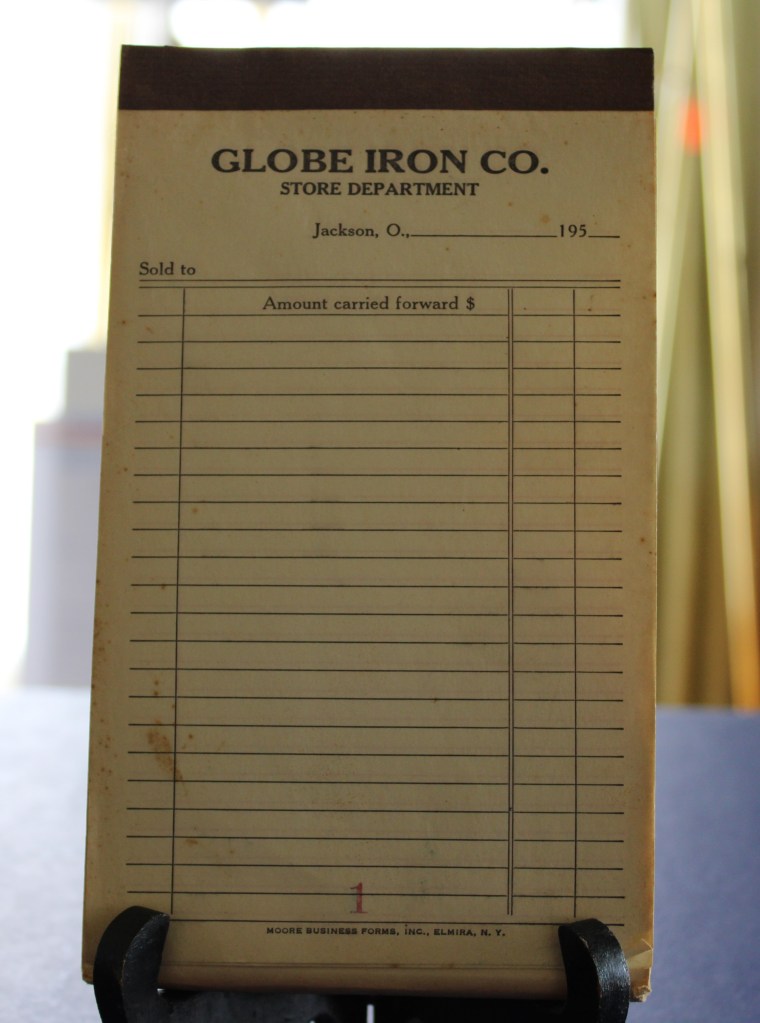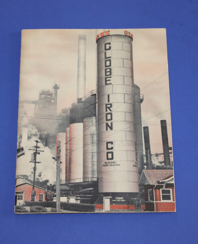 Description: Top Left: A Globe Iron Company store receipt book from the 1950s that is unused. Top Middle and Right: The front and back cover of a promotional booklet for Globe Iron Company. Bottom Left: Globe Iron employee badge number 1 issued to W. H. Allen. Bottom Middle: Globe Iron Company employee badge number 167 issued to Mayfield White. Bottom Right: A Globe Iron Company commemorative pin awarded to employees with 30 years of service.